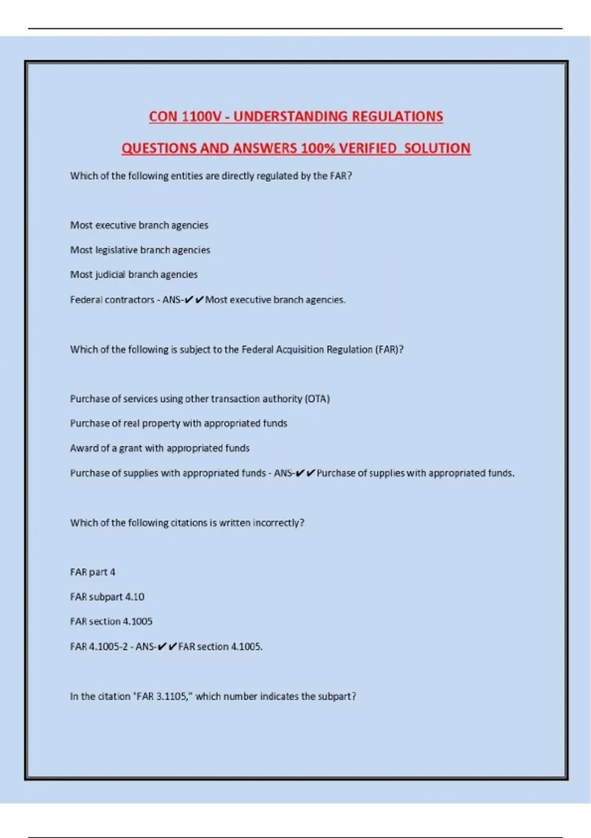 CON 1100V - UNDERSTANDING REGULATIONS QUESTIONS AND ANSWERS 100% VERIFIED SOLUTION Which of the following entities are directly regulated by the FAR? Most executive branch agencies Most legislative branch agencies Most judicial branch agencies Federal contractors - ANS-Most executive branch agencies. Which of the following is subject to the Federal Acquisition Regulation (FAR)? Purchase of services using other transaction authority (OTA) Purchase of real property with appropriated funds Award of a grant with appropriated funds Purchase of supplies with appropriated funds - ANS-Purchase of supplies with appropriated funds. Which of the following citations is written incorrectly? FAR part 4 FAR subpart 4.10 FAR section 4.1005 FAR 4.1005-2 - ANS-FAR section 4.1005. In the citation "FAR 3.1105," which number indicates the subpart?... Continues...