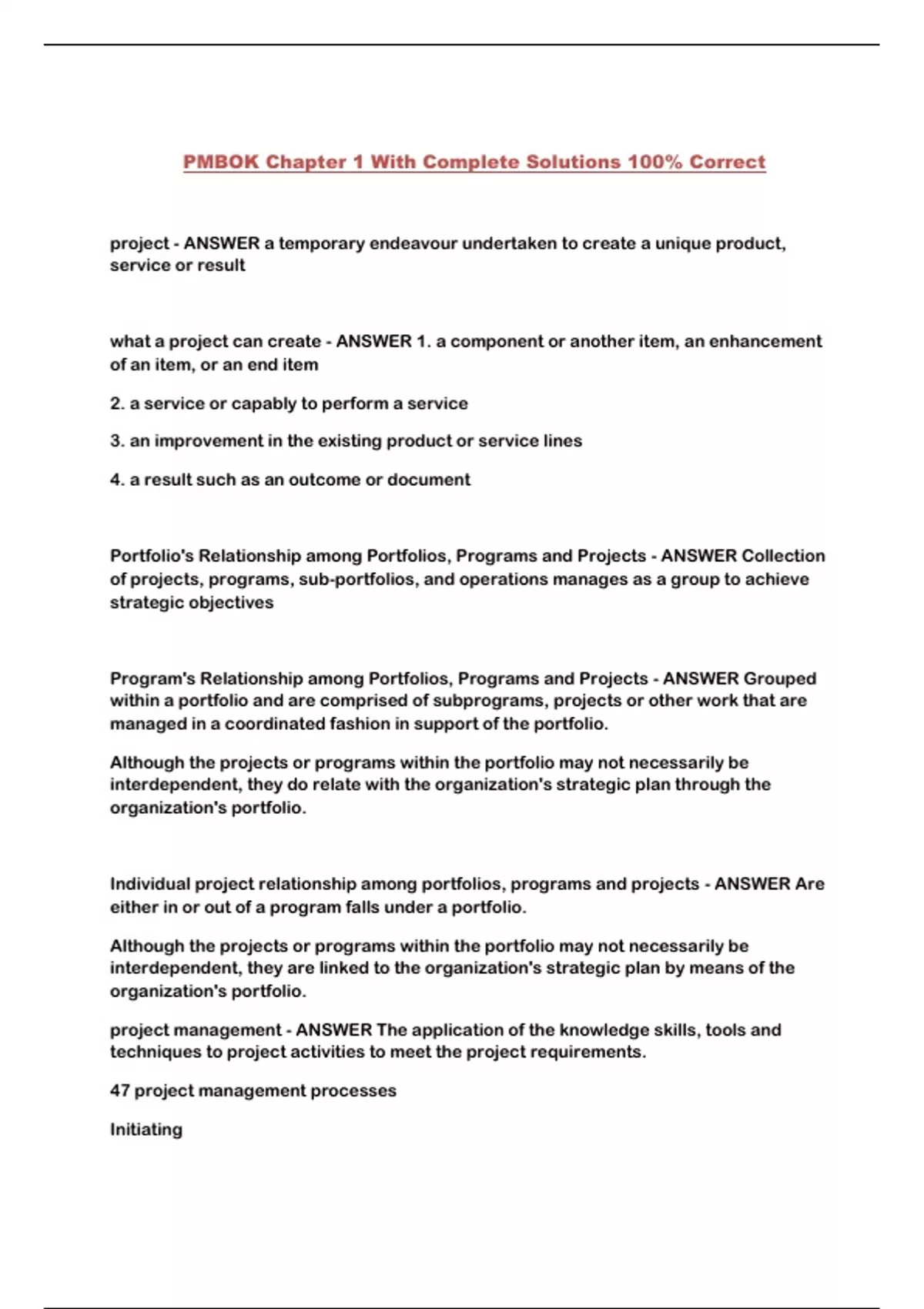 PMBOK Chapter 1 With Complete Solutions 100% Correct