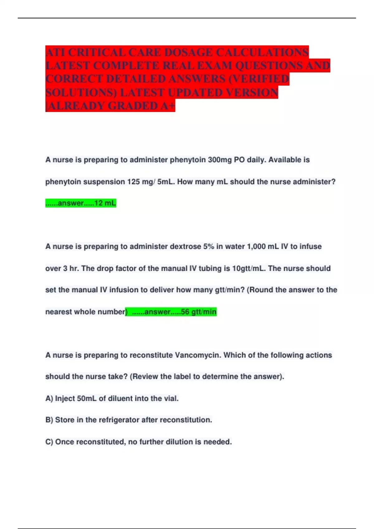 ATI CRITICAL CARE DOSAGE CALCULATIONS LATEST COMPLETE REAL EXAM QUESTIONS AND CORRECT DETAILED ANSWERS (VERIFIED SOLUTIONS) LATEST UPDATED VERSION |ALREADY GRADED A+
