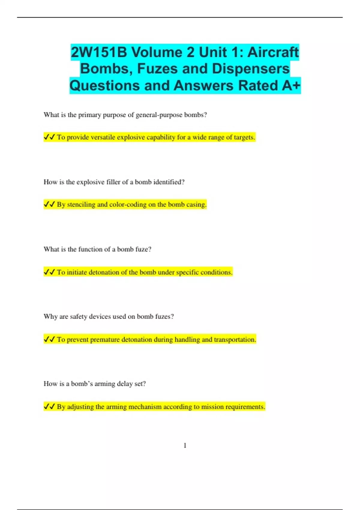 2W151B Volume 2 Unit 1: Aircraft Bombs, Fuzes and Dispensers Questions and Answers Rated A+ What is the primary purpose of general-purpose bombs? To provide versatile explosive capability for a wide range of targets. How is the explosive filler of a bomb identified? By stenciling and color-coding on the bomb casing. What is the function of a bomb fuze? To initiate detonation of the bomb under specific conditions. Why are safety devices used on bomb fuzes? To prevent premature detonation during handling and transportation. How is a bomb’s arming delay set? By adjusting the arming mechanism according to mission requirements. 2 What is the purpose of fin assemblies on bombs? To stabilize the bomb during its descent for accurate targeting. How are high-drag bomb configurations used in combat? They allow for low-altitude delivery by slowing the bomb's descent. What does the term "live bomb" indicate? The bomb contains explosive material and is ready for arming. Why are cluster bombs equipped with submunitions? To target multiple areas or spread effects over a wide area. What is the role of a bomb dispenser? To release submunitions or other payloads in a controlled manner. How are bomb racks inspected for operational readiness? By conducting functional tests and verifying attachment points. 3 What is the purpose of inert bombs in training? To simulate real bombs without explosive material for safe practice. How is a delay fuze different from an instantaneous fuze? A delay fuze detonates the bomb after a specific