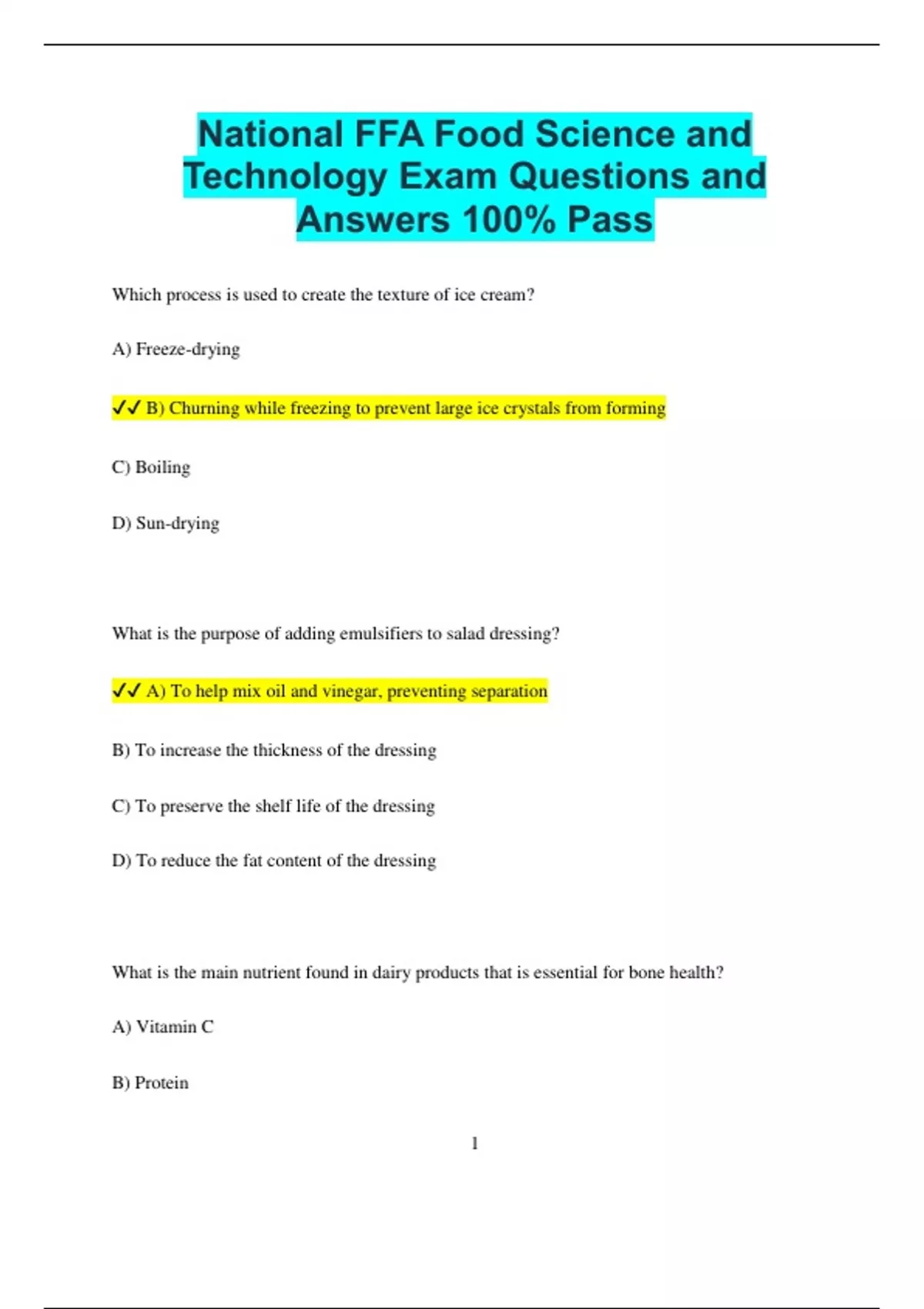 National FFA Food Science and Technology Exam Questions and Answers 100% Pass Which process is used to create the texture of ice cream? A) Freeze-drying B) Churning while freezing to prevent large ice crystals from forming C) Boiling D) Sun-drying What is the purpose of adding emulsifiers to salad dressing? A) To help mix oil and vinegar, preventing separation B) To increase the thickness of the dressing C) To preserve the shelf life of the dressing D) To reduce the fat content of the dressing What is the main nutrient found in dairy products that is essential for bone health? A) Vitamin C B) Protein 2 C) Calcium D) Iron How does water act as a solvent in food? A) It dissolves and carries nutrients, flavors, and minerals in food B) It makes food more solid C) It increases the calorie content of food D) It enhances the color of food What is the impact of food irradiation on food safety? A) It kills harmful microorganisms and extends shelf life without altering taste B) It makes food radioactive C) It enhances the flavor of food D) It reduces the nutritional value of food Which method is used to separate fat from milk to produce skim milk? A) Centrifugation B) Filtration 3 C) Freezing D) Boiling What is the primary function of carbohydrates in food? A) To provide protein for the body B) To store vitamins and minerals