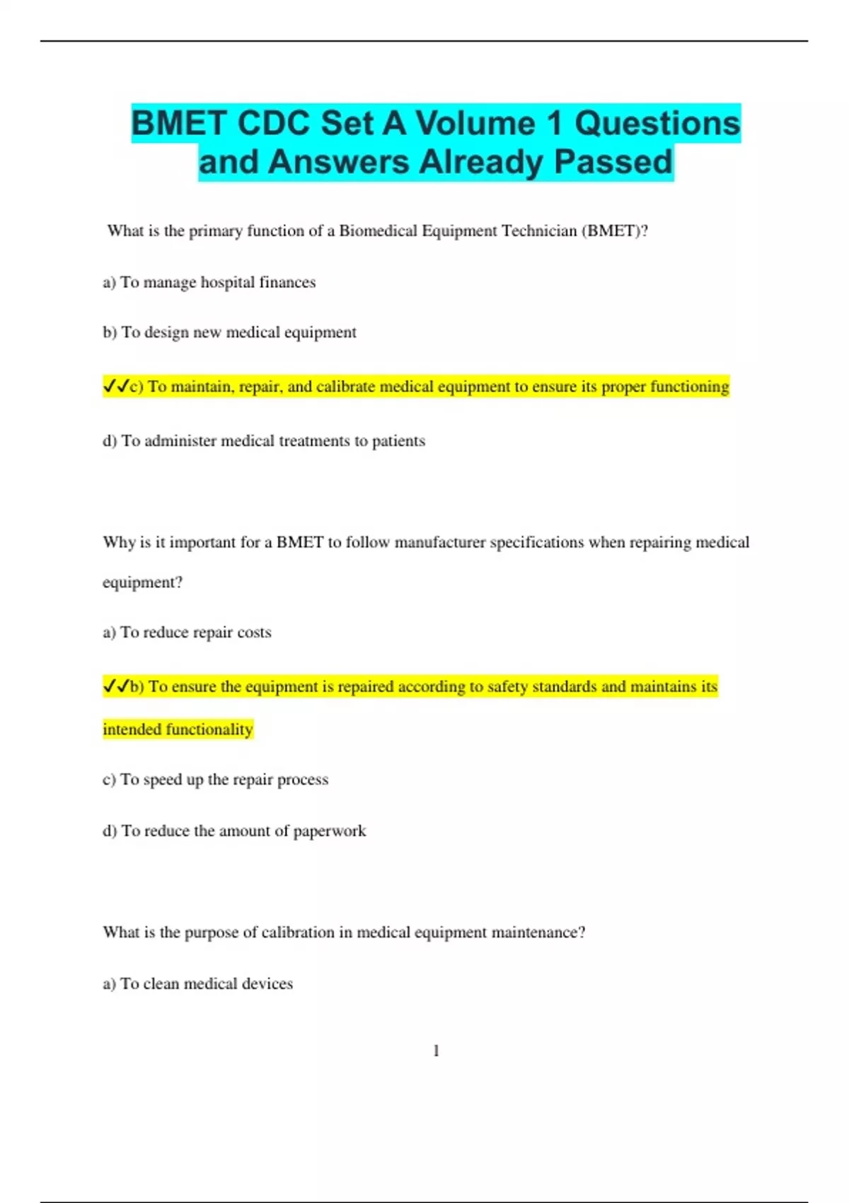BMET CDC Set A Volume 1 Questions and Answers Already Passed What is the primary function of a Biomedical Equipment Technician (BMET)? a) To manage hospital finances b) To design new medical equipment c) To maintain, repair, and calibrate medical equipment to ensure its proper functioning d) To administer medical treatments to patients Why is it important for a BMET to follow manufacturer specifications when repairing medical equipment? a) To reduce repair costs b) To ensure the equipment is repaired according to safety standards and maintains its intended functionality c) To speed up the repair process d) To reduce the amount of paperwork What is the purpose of calibration in medical equipment maintenance? a) To clean medical devices 2 b) To ensure that medical equipment provides accurate readings and performs correctly c) To improve the aesthetics of equipment d) To speed up the equipment's operation Why should a BMET be familiar with hospital safety regulations? a) To make hospital decisions b) To ensure the safety of both patients and healthcare workers when working with medical equipment c) To manage hospital finances d) To help design new medical equipment What is the role of preventative maintenance for medical equipment? a) To increase the cost of repairs b) To minimize the number of available devices c) To extend the life of equipment and prevent costly repairs by detecting issues early d) To decrease the need for medical personnel Why is it important for a BMET to document maintenance and repairs performed on equipment? 3 a) To track the service history of equipment and maintain compliance with healthcare regulations b) To reduce the workload of healthcare providers c) To avoid conducting repairs d) To maintain patient records What is the first step a BMET should take when troubleshooting a piece of medical equipment? a) Replace all components b) Call the manufacturer