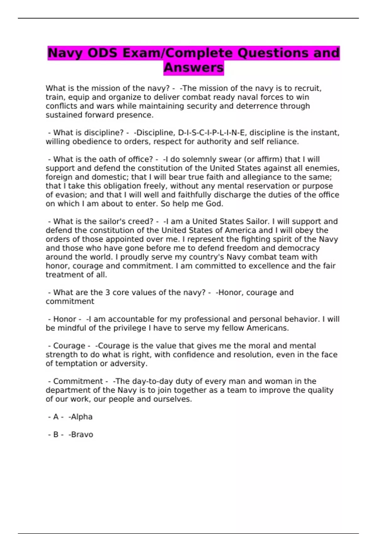 Navy ODS Exam/Complete Questions and