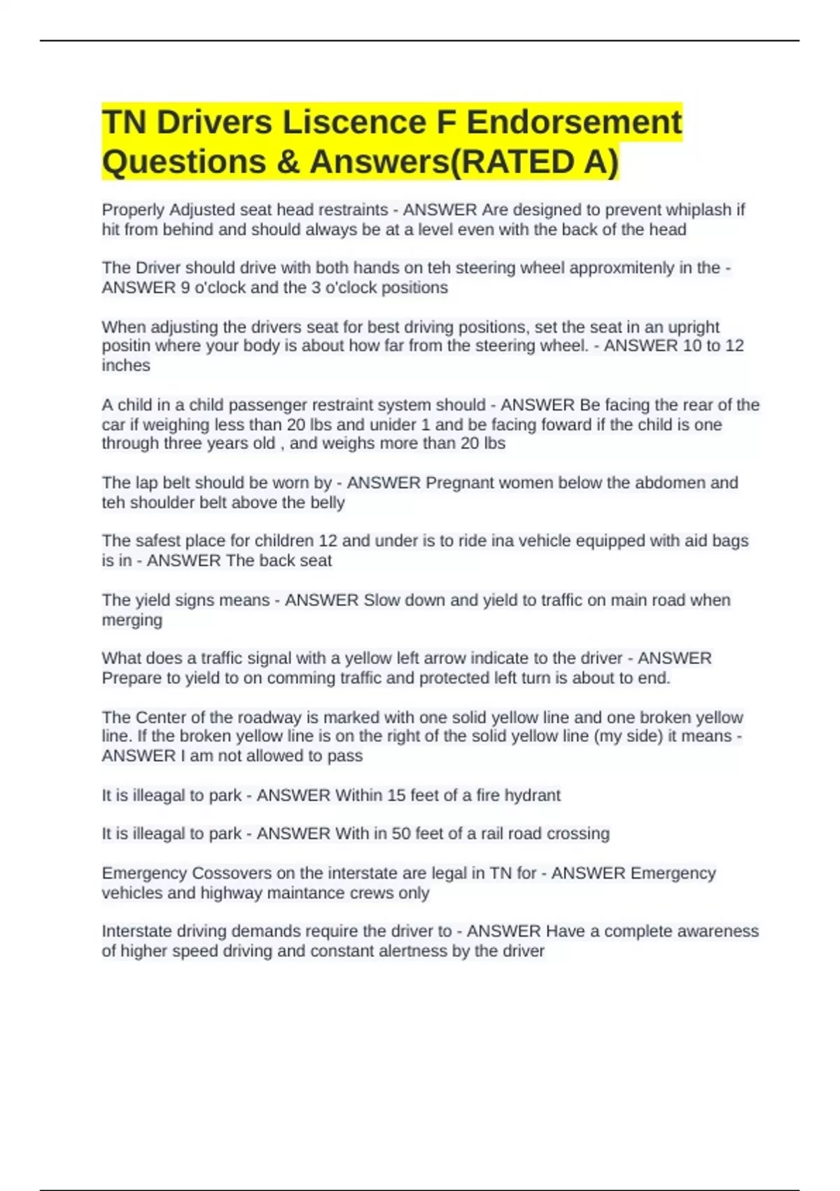 TN Drivers Liscence F Endorsement Questions & Answers(RATED A)
