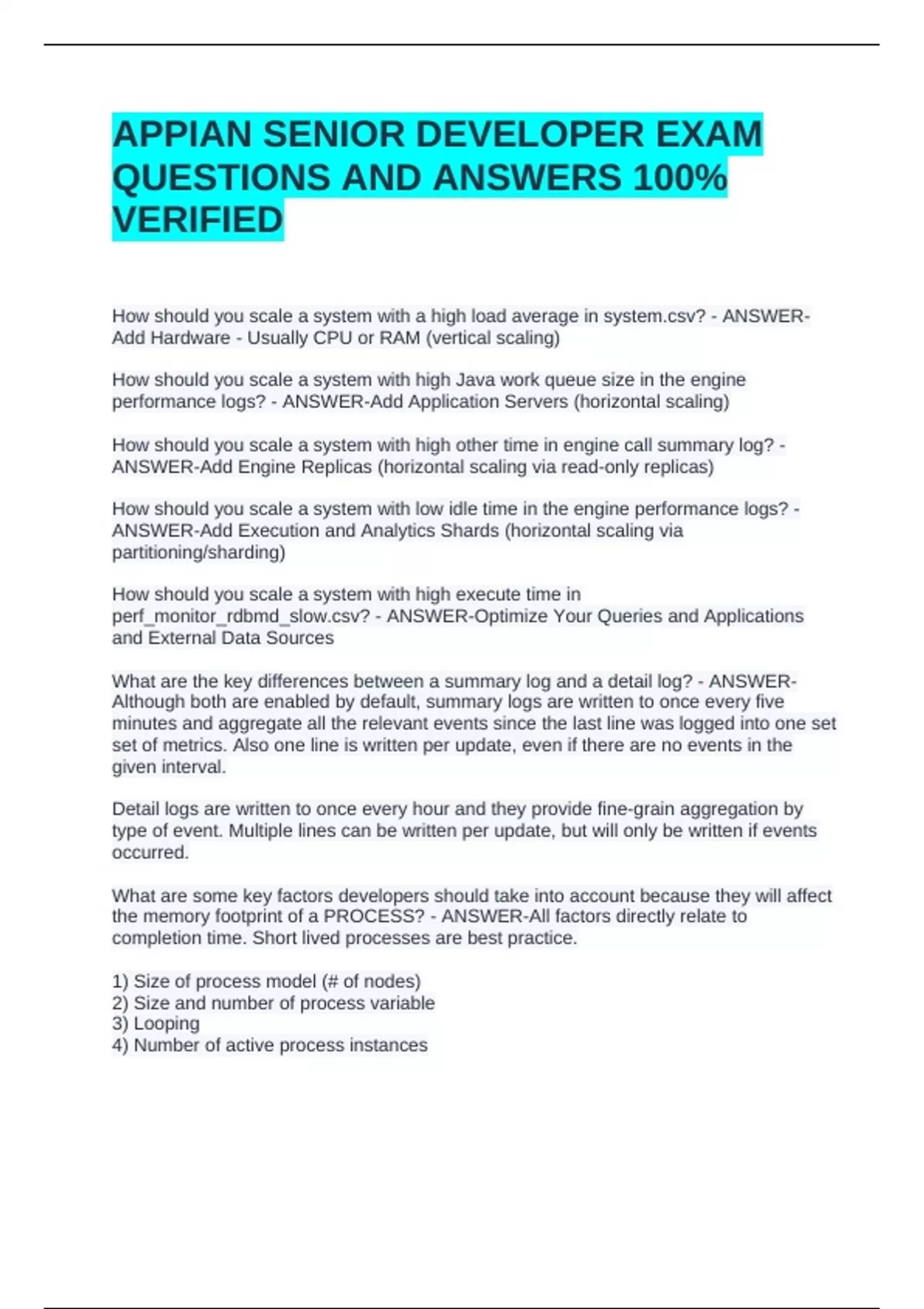 APPIAN SENIOR DEVELOPER EXAM QUESTIONS AND ANSWERS 100% VERIFIEDAPPIAN SENIOR DEVELOPER EXAM QUESTIONS AND ANSWERS 100% VERIFIED How should you scale a system with a high load average in ? - ANSWER-Add Hardware - Usually CPU or RAM (vertical scaling) How should you scale a system with high Java work queue size in the engine performance logs? - ANSWER-Add Application Servers (horizontal scaling) How should you scale a system with high other time in engine call summary log? - ANSWER-Add Engine Replicas (horizontal scaling via read-only replicas) How should you scale a system with low idle time in the engine performance logs? - ANSWER-Add Execution and Analytics Shards (horizontal scaling via partitioning/sharding)