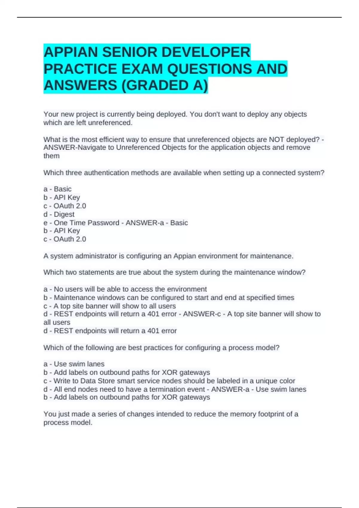 APPIAN SENIOR DEVELOPER PRACTICE EXAM QUESTIONS AND ANSWERS (GRADED A)APPIAN SENIOR DEVELOPER PRACTICE EXAM QUESTIONS AND ANSWERS (GRADED A)APPIAN SENIOR DEVELOPER PRACTICE EXAM QUESTIONS AND ANSWERS (GRADED A) Your new project is currently being deployed. You don't want to deploy any objects which are left unreferenced. What is the most efficient way to ensure that unreferenced objects are NOT deployed? - ANSWER-Navigate to Unreferenced Objects for the application objects and remove them Which three authentication methods are available when setting up a connected system? a - Basic b - API Key c - OAuth 2.0 d - Digest e - One Time Password - ANSWER-a - Basic