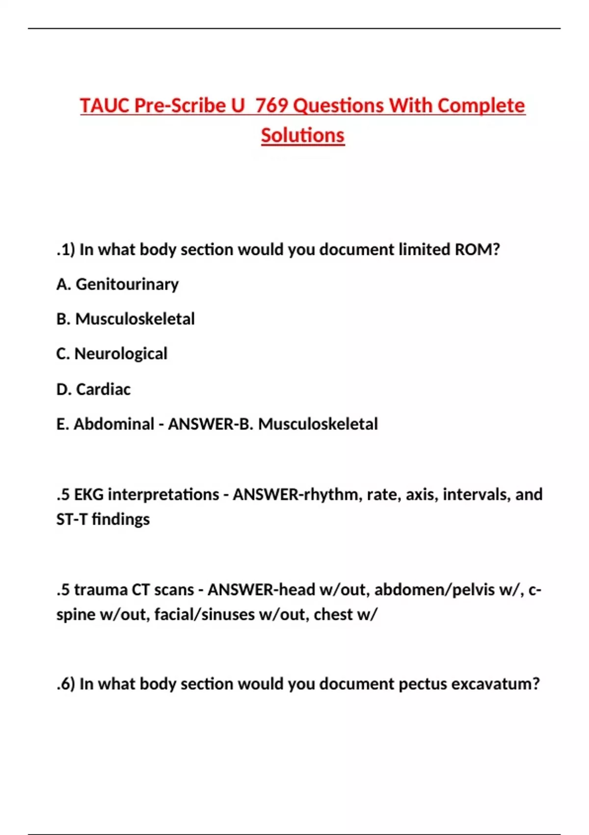 TAUC scribe Exam Questions With 100% Correct Answers .abdominal - ANSWER-no CVA tenderness on palpation .abdominal - ANSWER-normoactive bowel sounds .abscess - ANSWER-pus underneath the skin .accessory muscle use - ANSWER-using muscles of the abdomen and shoulder to breath, indicates increased work of breathing and respiratory distress .anisocoria - ANSWER-condition characterized by unequal pupil size .anterior gontanel - ANSWER-soft spot on the infants skull .aphasia - ANSWER-neurological- impairment of language affecting the production of speech due to injury to the brain .aphthous ulcers - ANSWER-a small, shallow sore found in the mouth, canker sore .ataxia - ANSWER-loss of full control of bodily movements; loss of coordination .atraumatic - ANSWER-no injury .bradycardic - ANSWER-decreased heart rate .Brudzinkski's sign - ANSWER-positive when flexing a pts neck forward causes them to flex their hop and knees and it causes pain .cachectic - ANSWER-malnourished .calf tenderness - ANSWER-musculoskeletal- tenderness when palpating the calf, may indicate DVT .cardiac - ANSWER-heart is normal to auscultation .cardiac - ANSWER-no edema to lower extremities .cardiac - ANSWER-peripheral pulses are 2+ and symmetric .cardiac - ANSWER-pulses