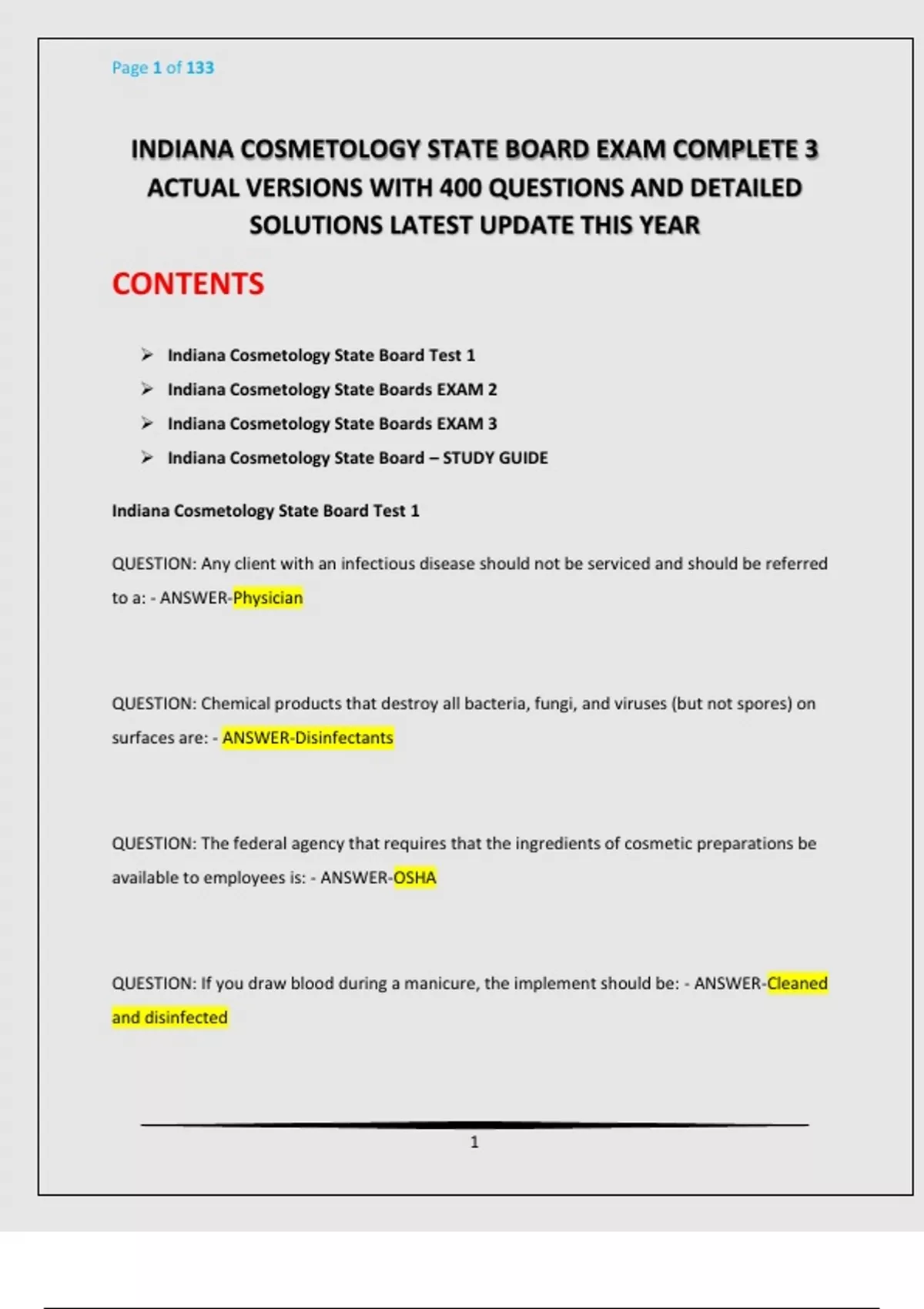 INDIANA COSMETOLOGY STATE BOARD EXAM COMPLETE 3 ACTUAL VERSIONS WITH 400 QUESTIONS AND DETAILED SOLUTIONS LATEST UPDATE THIS YEAR