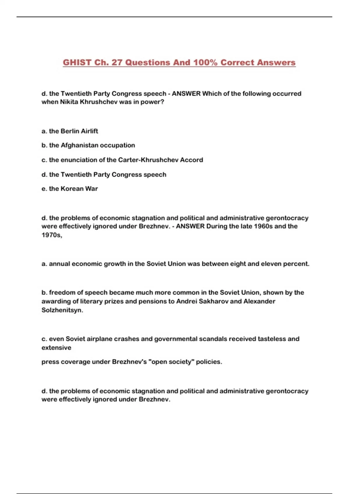 d. the Twentieth Party Congress speech - ANSWER Which of the following occurred