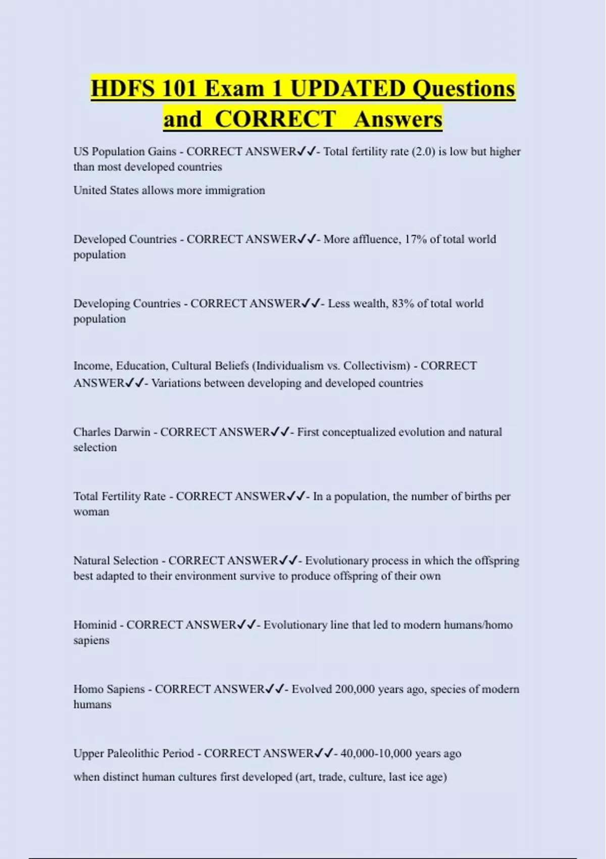HDFS 101 Exam 1 UPDATED Questions and CORRECT Answers US Population Gains - CORRECT ANSWER- Total fertility rate (2.0) is low but higher than most developed countries United States allows more immigration Developed Countries - CORRECT ANSWER- More affluence, 17% of total world population