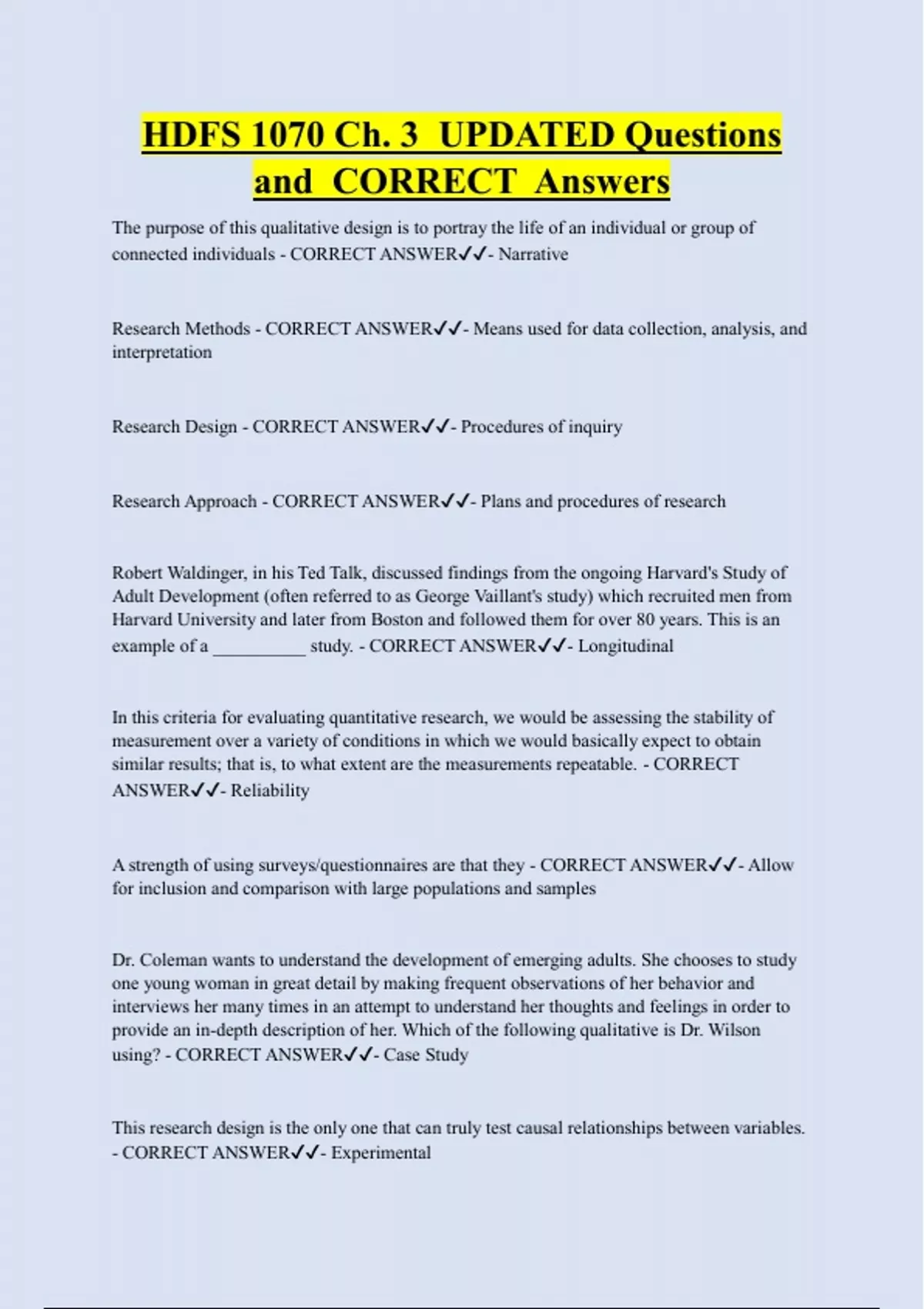 example of a __________ study. - CORRECT ANSWER✔✔- Longitudinal