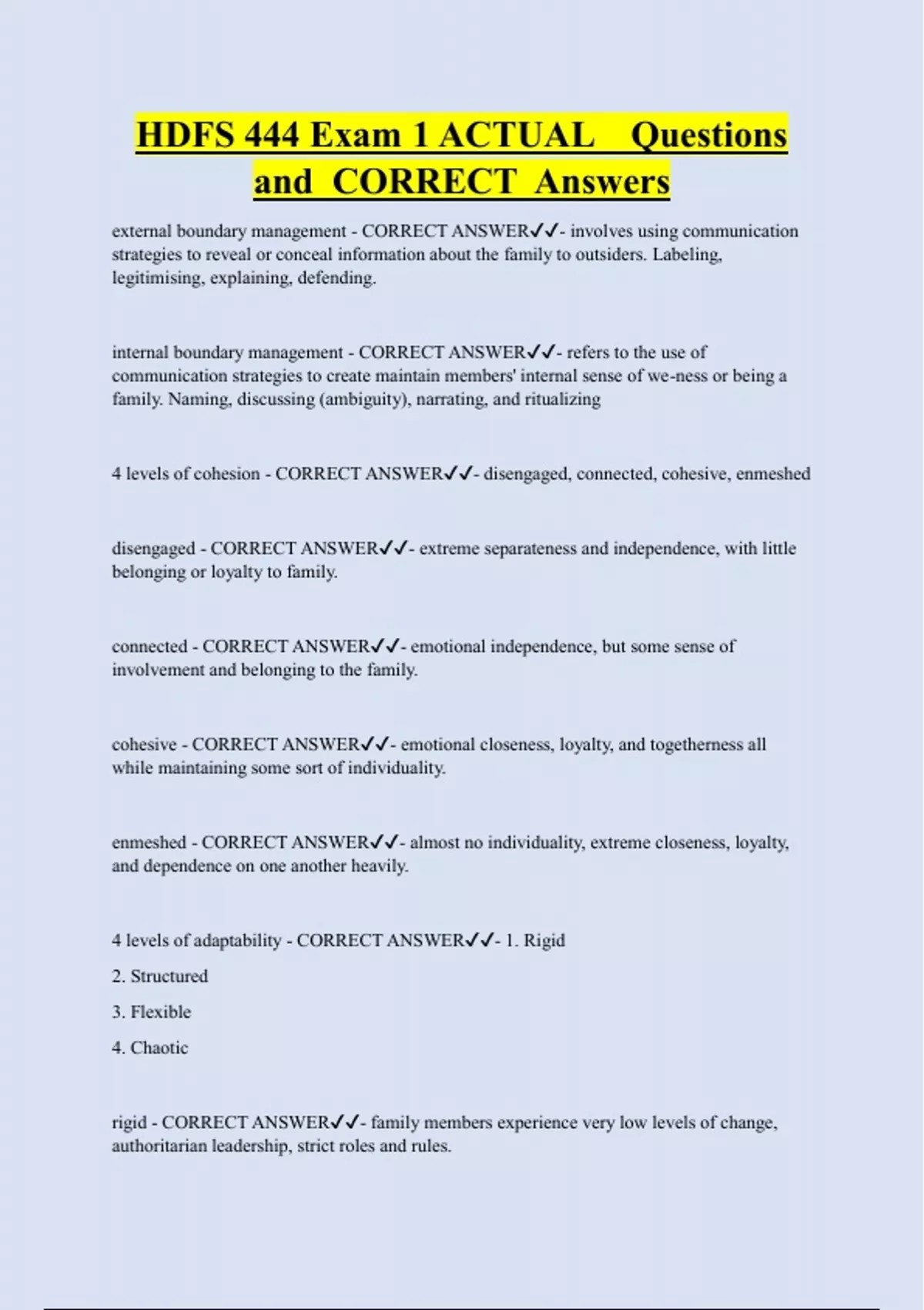 4 levels of cohesion - CORRECT ANSWER✔✔- disengaged, connected, cohesive, enmeshed