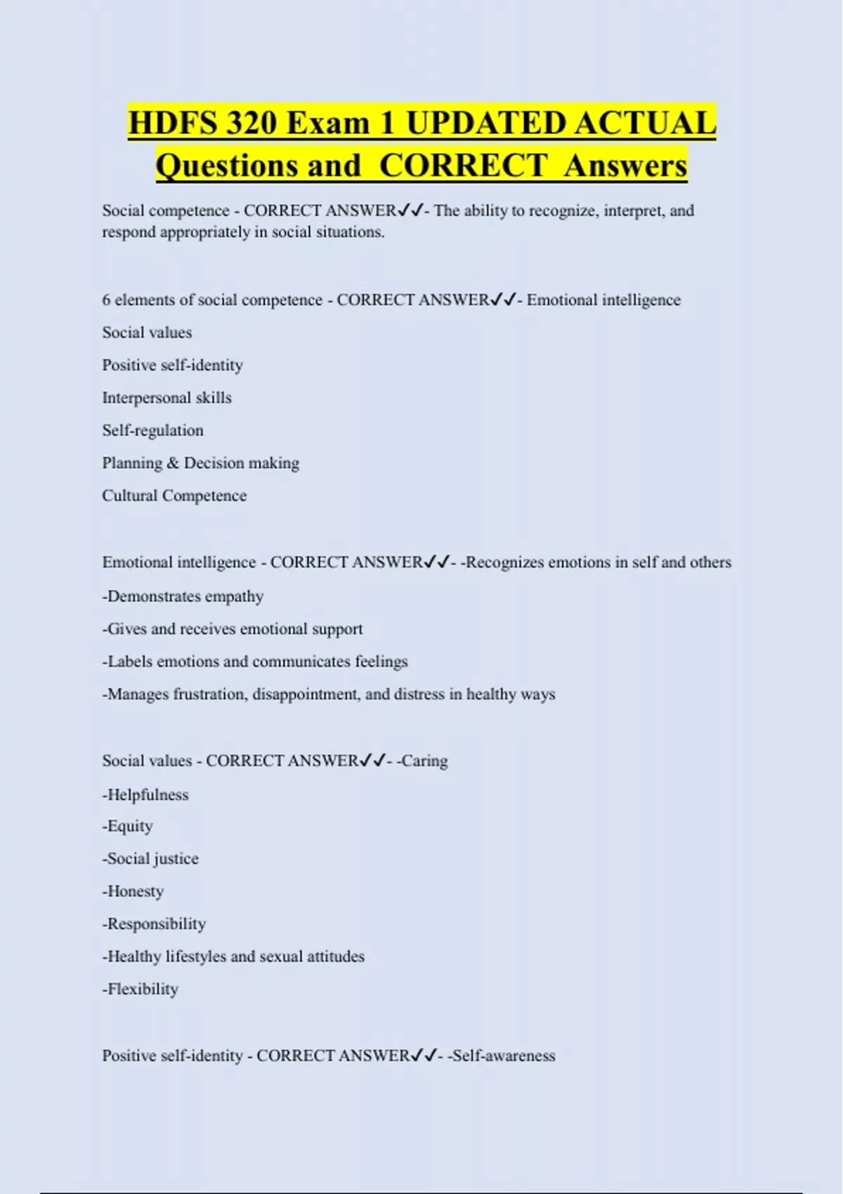HDFS 320 Exam 1 UPDATED ACTUAL Questions and CORRECT Answers Social competence - CORRECT ANSWER- The ability to recognize, interpret, and respond appropriately in social situations. 6 elements of social competence - CORRECT ANSWER- Emotional intelligence Social values Positive self-identity Interpersonal skills Self-regulation Planning & Decision making Cultural Competenc