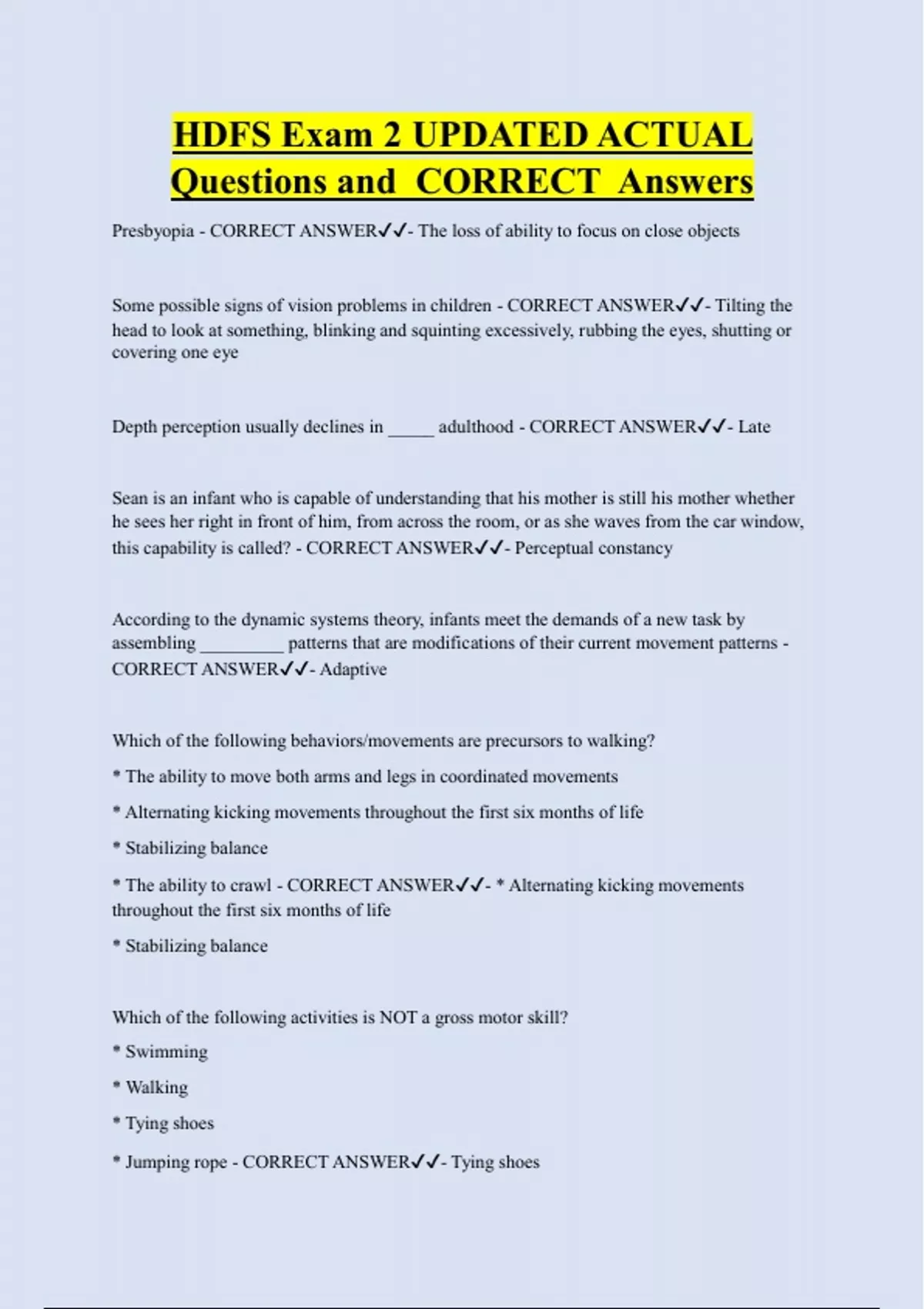 HDFS Exam 2 UPDATED ACTUAL Questions and CORRECT Answers Presbyopia - CORRECT ANSWER- The loss of ability to focus on close objects Some possible signs of vision problems in children - CORRECT ANSWER- Tilting the head to look at something, blinking and squinting excessively, rubbing the eyes, shutting or covering one eye Depth perception usually declines in _____ adulthood - CORRECT ANSWER- Late