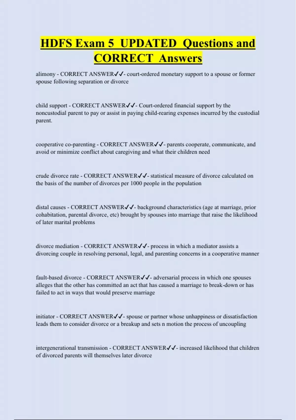 HDFS Exam 5 UPDATED Questions and CORRECT Answers alimony - CORRECT ANSWER- court-ordered monetary support to a spouse or former spouse following separation or divorce child support - CORRECT ANSWER- Court-ordered financial support by the noncustodial parent to pay or assist in paying child-rearing expenses incurred by the custodial parent.