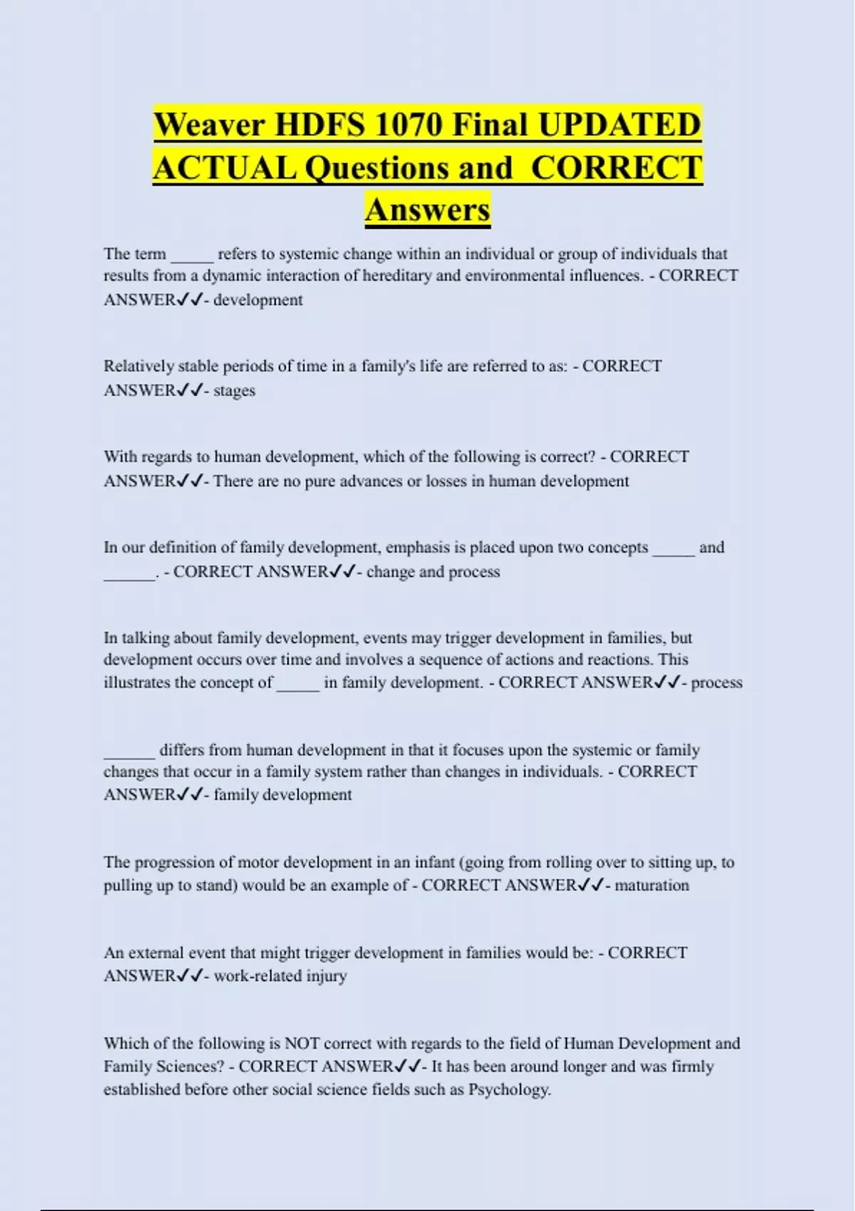 Weaver HDFS 1070 Final UPDATED ACTUAL Questions and CORRECT Answers The term _____ refers to systemic change within an individual or group of individuals that results from a dynamic interaction of hereditary and environmental influences. - CORRECT ANSWER- development Relatively stable periods of time in a family's life are referred to as: - CORRECT ANSWER- stages
