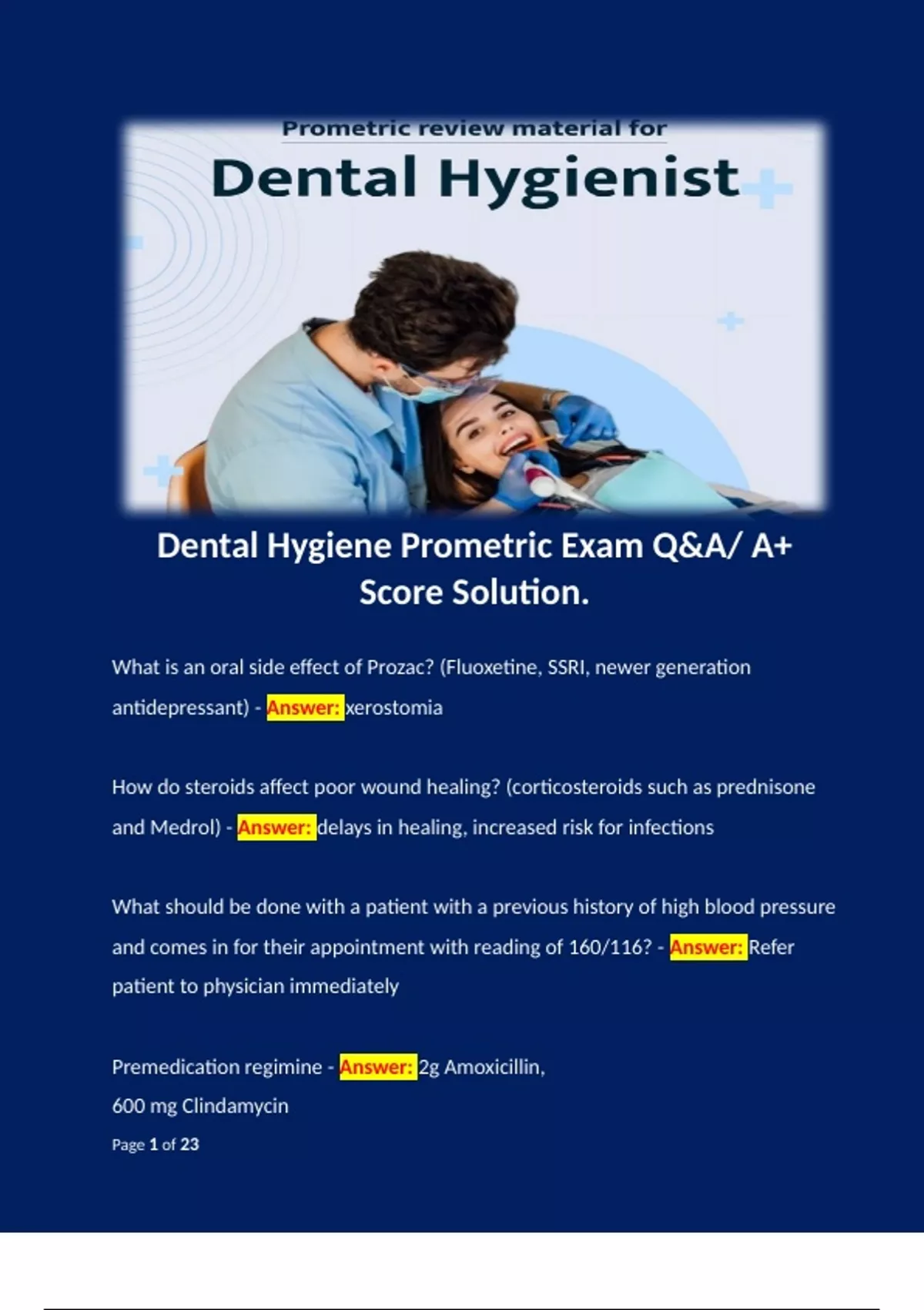 Dental Hygiene Prometric Exam Q&A/ A+ Score Solution. What is an oral side effect of Prozac? (Fluoxetine, SSRI, newer generation antidepressant) - Answer: xerostomia How do steroids affect poor wound healing? (corticosteroids such as prednisone and Medrol) - Answer: delays in healing, increased risk for infections What should be done with a patient with a previous history of high blood pressure and comes in for their appointment with reading of 160/116? - Answer: Refer patient to physician immediately Premedication regimine - Answer: 2g Amoxicillin, 600 mg Clindamycin (if allergic to Amoxicillin/Penicillin) Patient comes in for appointment who needs premed, and they took 300 mg of Clindamycin 1 hour prior to their appointment. What would you do? - Answer: Administer another 300 mg and wait 1 hour prior to treatment (because Clindamycin premedication is 600 mg 1 hour prior to treatment) What is a PAN used for? - Answer: location of 3rd molars, impactions, pathology - NOT FOR BONE LOSS Items that contain fluoride? - Answer: pork, fish, tea