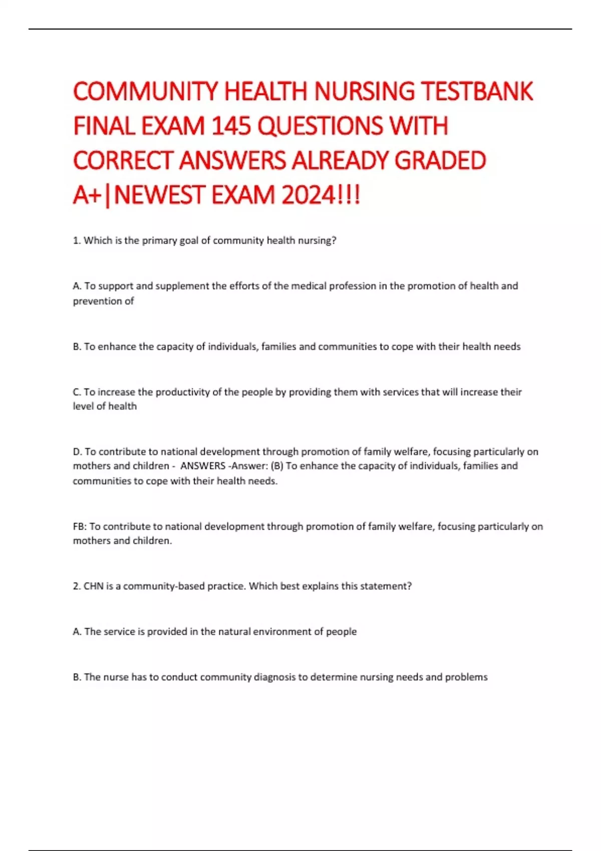 COMMUNITY HEALTH NURSING TESTBANK FINAL EXAM 145 QUESTIONS WITH CORRECT ANSWERS ALREADY GRADED A+|NEWEST EXAM 2024!!! COMMUNITY HEALTH NURSING TESTBANK FINAL EXAM 145 QUESTIONS WITH CORRECT ANSWERS ALREADY GRADED A+|NEWEST EXAM 2024!!! COMMUNITY HEALTH NURSING TESTBANK FINAL EXAM 145 QUESTIONS WITH CORRECT ANSWERS ALREADY GRADED A+|NEWEST EXAM 2024!!! COMMUNITY HEALTH NURSING TESTBANK FINAL EXAM 145 QUESTIONS WITH CORRECT ANSWERS ALREADY GRADED A+|NEWEST EXAM 2024!!! COMMUNITY HEALTH NURSING TESTBANK FINAL EXAM 145 QUESTIONS WITH CORRECT ANSWERS ALREADY GRADED A+|NEWEST EXAM 2024!!! COMMUNITY HEALTH NURSING TESTBANK FINAL EXAM 145 QUESTIONS WITH CORRECT ANSWERS ALREADY GRADED A+|NEWEST EXAM 2024!!! COMMUNITY HEALTH NURSING TESTBANK FINAL EXAM 145 QUESTIONS WITH CORRECT ANSWERS ALREADY GRADED A+|NEWEST EXAM 2024!!! COMMUNITY HEALTH NURSING TESTBANK FINAL EXAM 145 QUESTIONS WITH CORRECT ANSWERS ALREADY GRADED A+|NEWEST EXAM 2024!!! COMMUNITY HEALTH NURSING TESTBANK FINAL EXAM 145 QUESTIONS WITH CORRECT ANSWERS ALREADY GRADED A+|NEWEST EXAM 2024!!! COMMUNITY HEALTH NURSING TESTBANK FINAL EXAM 145 QUESTIONS WITH CORRECT ANSWERS ALREADY GRADED A+|NEWEST EXAM 2024!!! COMMUNITY HEALTH NURSING TESTBANK FINAL EXAM 145 QUESTIONS WITH CORRECT ANSWERS ALREADY GRADED A+|NEWEST EXAM 2024!!! COMMUNITY HEALTH NURSING TESTBANK FINAL EXAM 145 QUESTIONS WITH CORRECT ANSWERS ALREADY GRADED A+|NEWEST EXAM 2024!!!