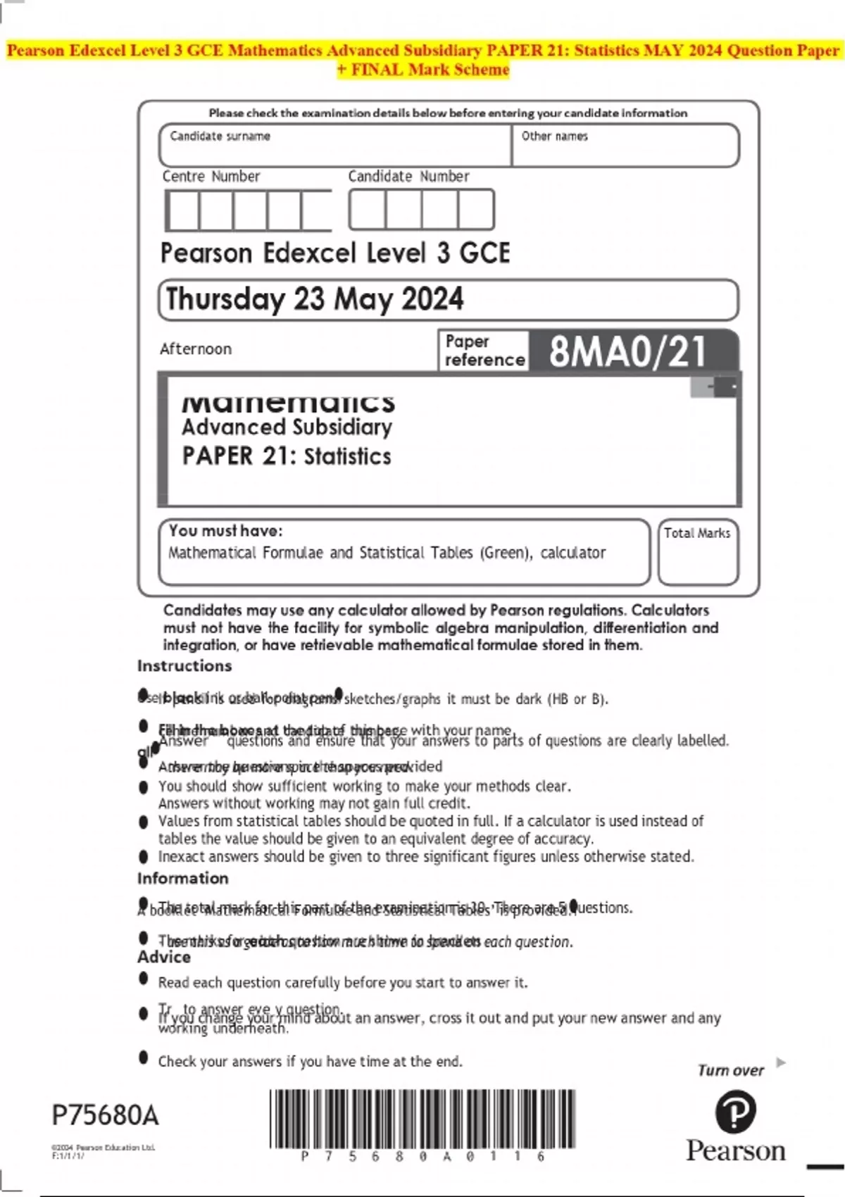 Pearson Edexcel Level 3 GCE Mathematics Advanced Subsidiary PAPER 21: Statistics MAY 2024 Question Paper + FINAL Mark Scheme