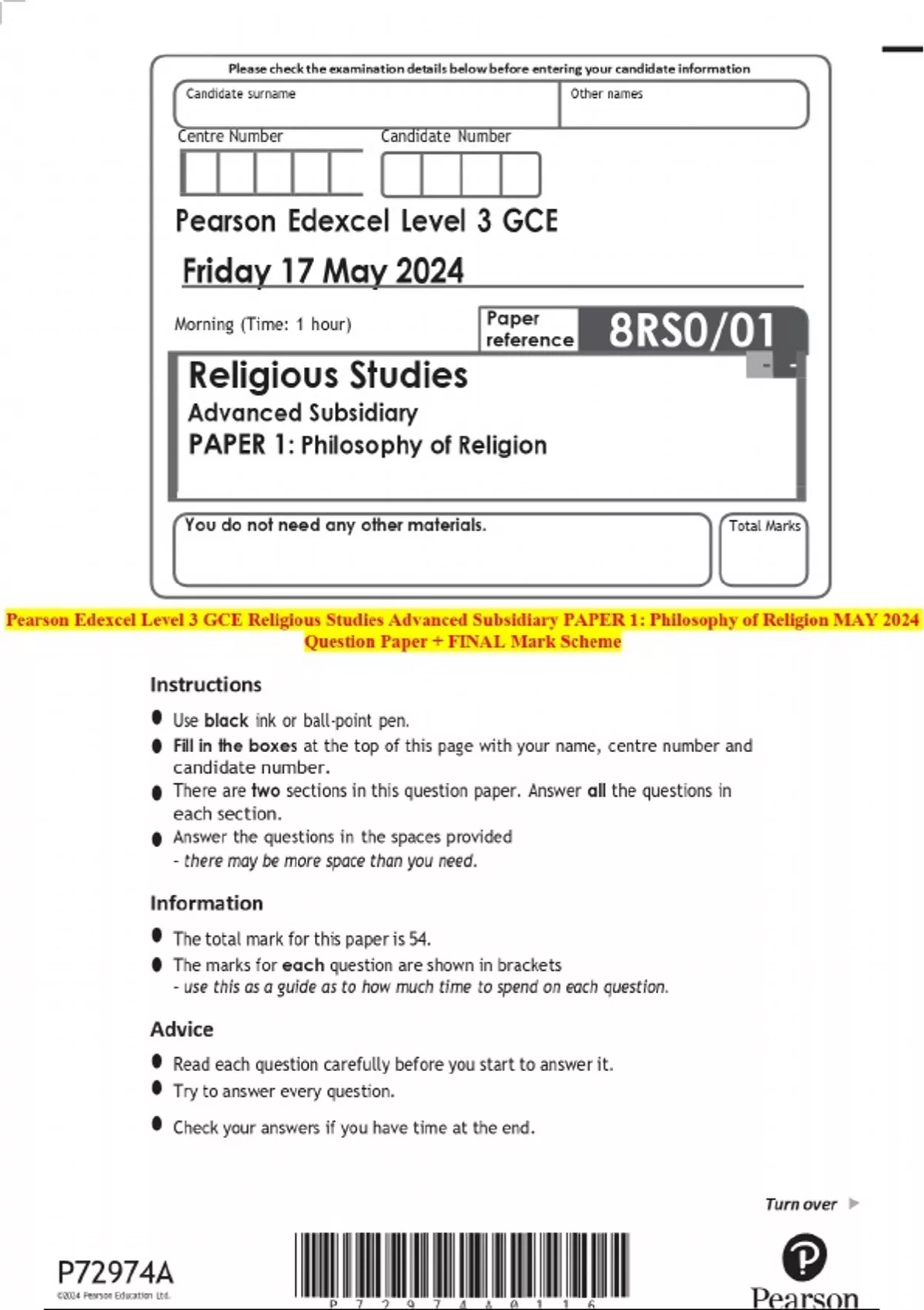 Pearson Edexcel Level 3 GCE Religious Studies Advanced Subsidiary PAPER 1: Philosophy of Religion MAY 2024 Question Paper + FINAL Mark Scheme