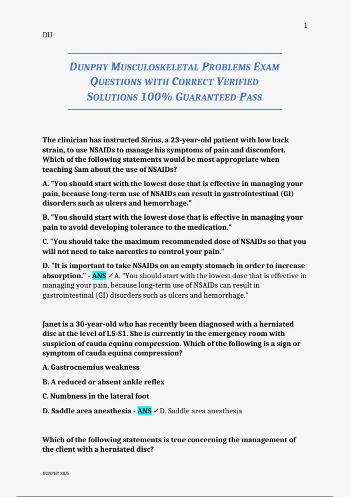 DUNPHY MUSCULOSKELETAL PROBLEMS EXAM