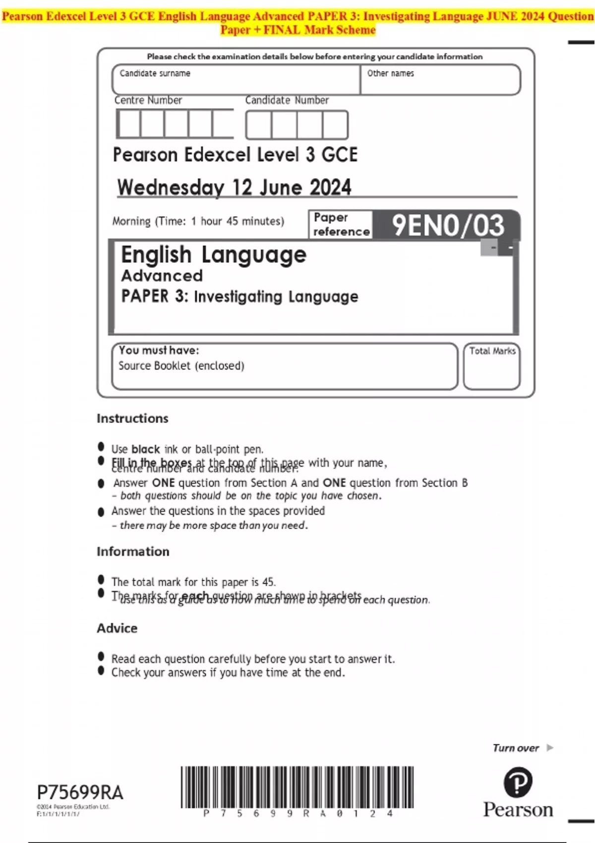 Pearson Edexcel Level 3 GCE English Language Advanced PAPER 3: Investigating Language JUNE 2024 Question Paper + FINAL Mark Scheme