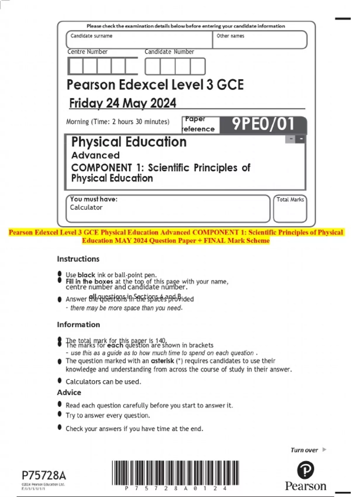 Pearson Edexcel Level 3 GCE Physical Education Advanced COMPONENT 1: Scientific Principles of Physical Education MAY 2024 Question Paper + FINAL Mark Scheme