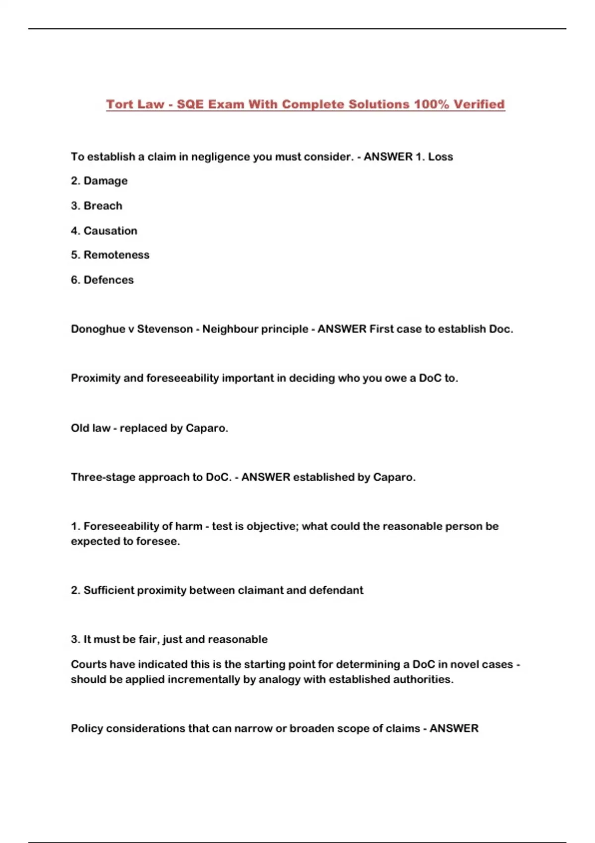 Tort Law - SQE Exam With Complete Solutions 100% Verified...