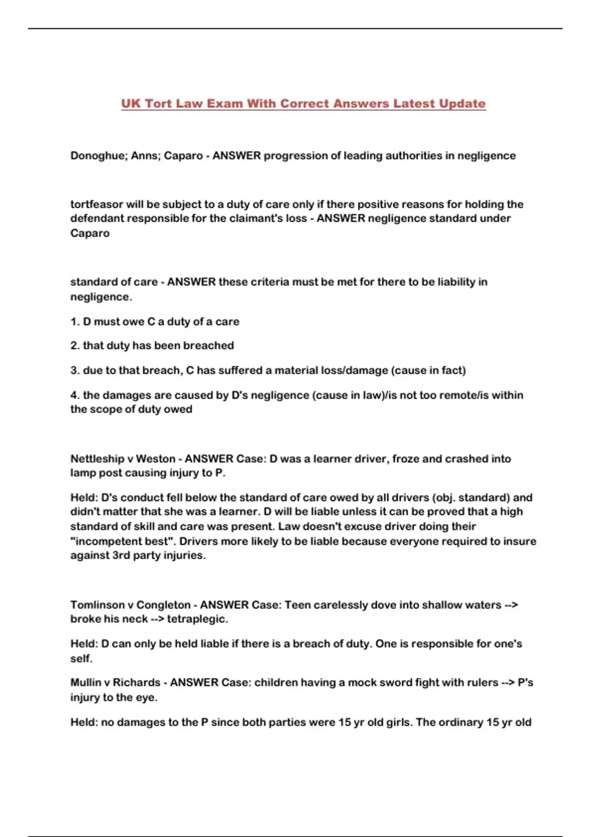 UK Tort Law Exam With Correct Answers Latest Update