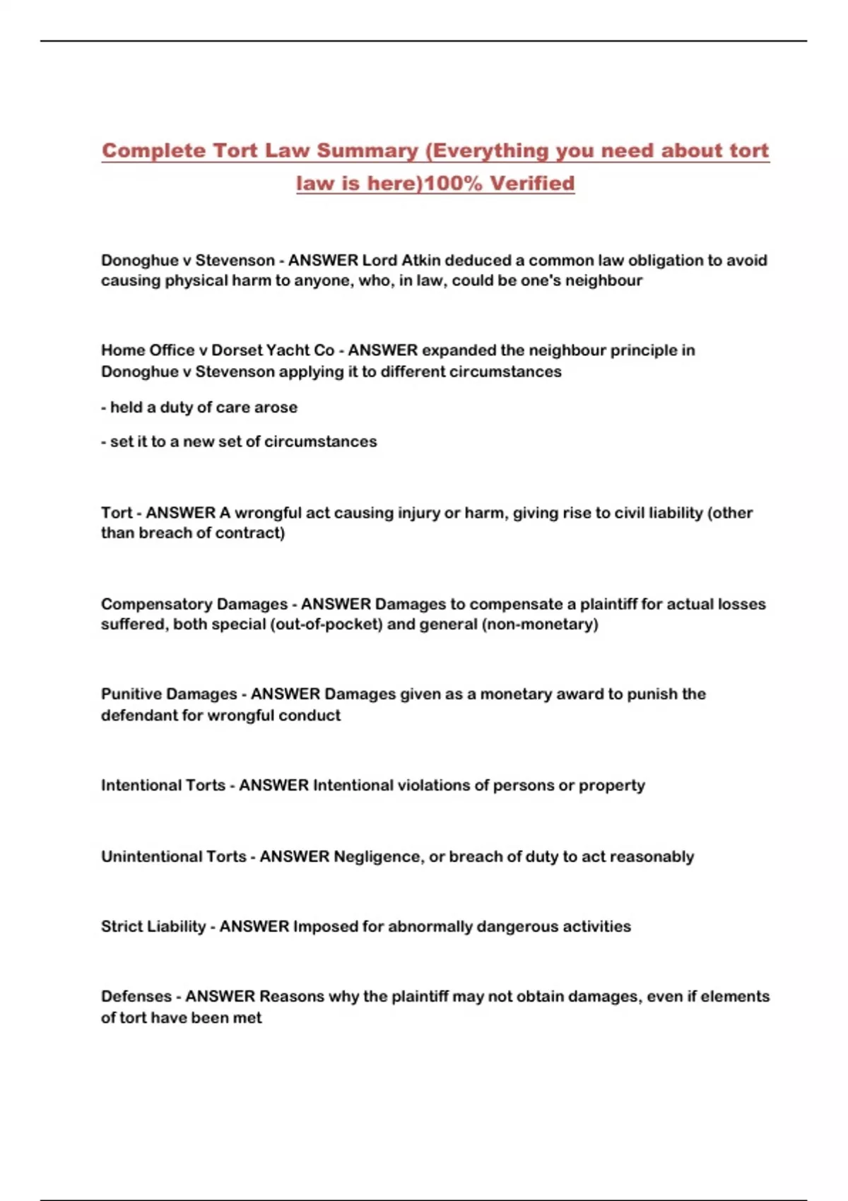 Complete Tort Law Summary (Everything you need about tort law is here)100% Verified