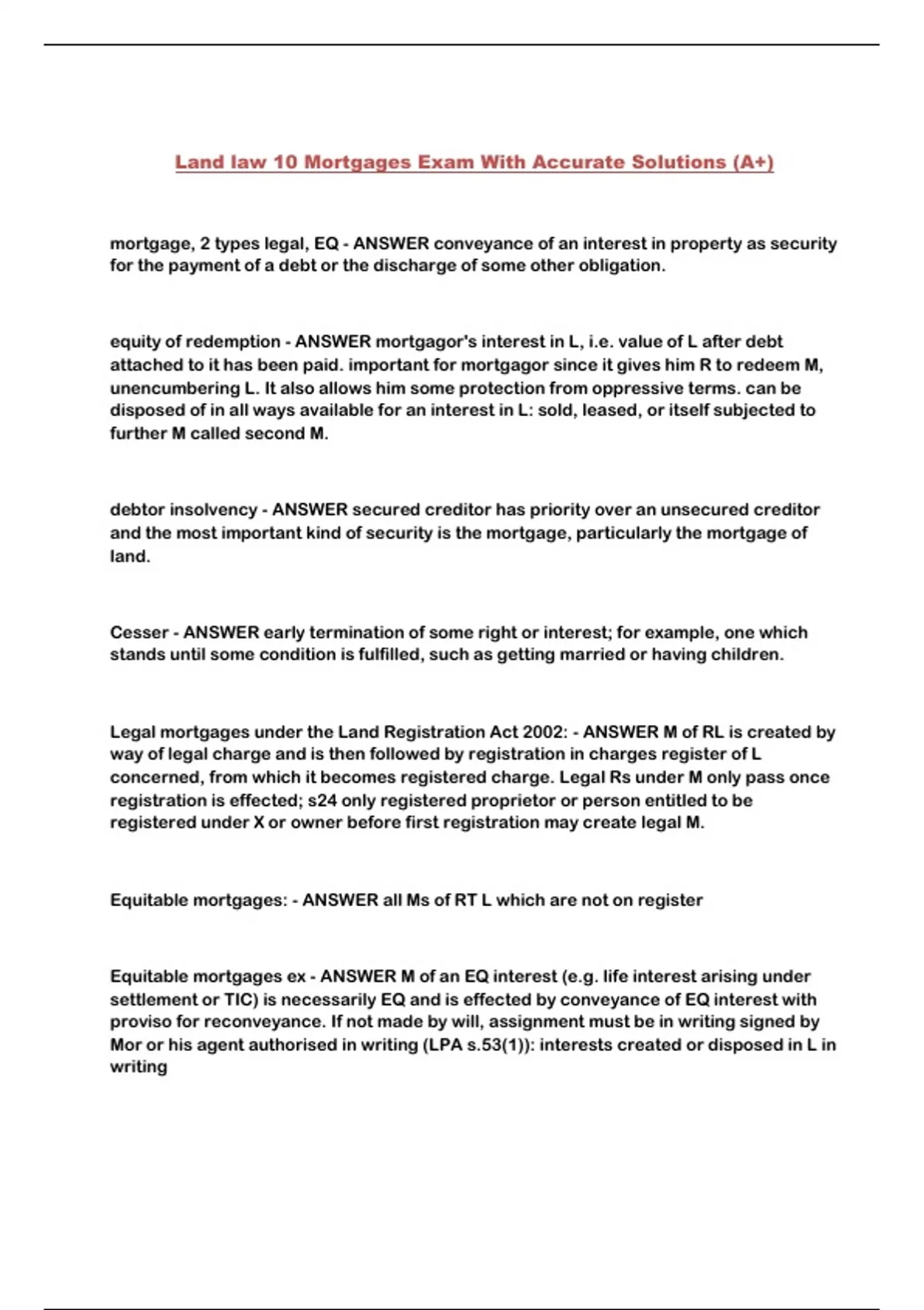 Land law 10 Mortgages Exam With Accurate Solutions (A+)