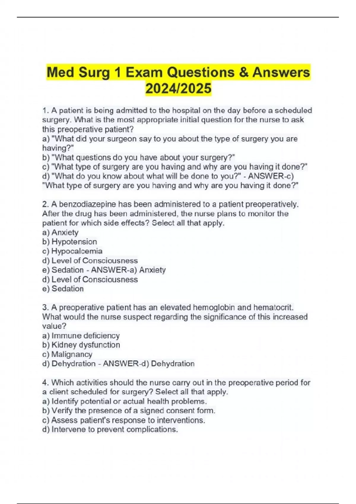 Med Surg 1 Exam Questions & Answers 2024/2025 1. A patient is being admitted to the hospital on the day before a scheduled surgery. What is the most appropriate initial question for the nurse to ask this preoperative patient? a) "What did your surgeon say to you about the type of surgery you are having?" b) "What questions do you have about your surgery?" c) "What type of surgery are you having and why are you having it done?" d) "What do you know about what will be done to you?" - ANSWER-c) "What type of surgery are you having and why are you having it done?" 2. A benzodiazepine has been administered to a patient preoperatively. After the drug has been administered, the nurse plans to monitor the patient for which side effects? Select all that apply. a) Anxiety b) Hypotension c) Hypocalcemia d) Level of Consciousness e) Sedation - ANSWER-a) Anxiety d) Level of Consciousness e) Sedation 3. A preoperative patient has an elevated hemoglobin and hematocrit. What would the nurse suspect regarding the significance of this increased value? a) Immune deficiency b) Kidney dysfunction c) Malignancy d) Dehydration - ANSWER-d) Dehydration 4. Which activities should the nurse carry out in the preoperative period for a client scheduled for surgery? Select all that apply. a) Identify potential or actual health problems. b) Verify the presence of a signed consent form. c) Assess patient's response to interventions. d) Intervene to prevent complications. e) Assess effectiveness of teaching related to postoperative recovery. - ANSWER-a) Identify potential or actual health problems. b) Verify the presence of a signed consent form. e) Assess effectiveness of teaching related to postoperative recovery. 5. A patient having surgery has a degree of risk associated with the surgery. The nurse would evaluate which patient-related factors as contributing to a high degree of risk associated with surgery? Select all that apply. a) Type of institution where surgery is performed b) Involvement of vital organs c) Average nutritional status d) Low likelihood of procedure complications e) A history of respiratory disease and diabetes - ANSWER-b) Involvement of vital organs e) A history of respiratory disease and diabetes 6. A patient has just entered the postanesthesia care unit (PACU) from surgery. For which priority needs should the nurse immediately assess the postoperative patient? a) Vital signs, level of consciousness, presence of pain b) Skin coloring, surgical incision, limb movements c) Skin temperature, blood pressure, mental status d) Temperature, emotional status, wound drainage - ANSWER-a) Vital signs, level of consciousness, presence of pain 7. The nurse in the postanesthesia care unit (PACU) is assessing a postoperative patient. Which indicators suggest to the nurse an alteration in tissue perfusion? Select all that apply. a) Pallor or cyanosis b) Difficulty with mobility c) Pain in the incision area d) Fluid loss e) Decreased urinary output - ANSWER-a) Pallor or cyanosis d) Fluid loss e) Decreased urinary output 8. After surgery, the nurse encourages the patient to move from side to side at least every 2 hours. The patient questions this activity. How does the nurse explain the purpose of this intervention? a) Assist peristalsis to return more quickly b) Lessen muscle weakness c) Increase patient's ability to sleep d) Let the lungs alternatively achieve maximum expansion - ANSWER-d) Let the lungs alternatively achieve maximum expansion 9. The nurse is creating a plan of care for a postoperative patient. The nursing diagnosis in acute pain. What would be appropriate outcomes for this patient? Select all that apply. a) Balanced fluid intake and output b) Seeks help as needed c) Absence of nonverbal signs of pain d) Performs leg exercises as instructed e) Verbally rates pain as 3 on a 1 to 10 scale - ANSWER-c) Absence of nonverbal signs of pain e) Verbally rates pain as 3 on a 1 to 10 scale 10. The patient has been in the post anesthesia care unit (PACU) for one hour. The patient is now groggy but able to respond to voice commands. While assessing the patient, for what reason would the nurse check the bedclothes underneath the patient? a) Determine drainage from tubes or drains b) Assess for fluid balance c) Detect for possible hemorrhage d) Monitor perspiration - ANSWER-c) Detect for possible hemorrhage 11. A 65-year-old was diagnosed and treated for right lower lobe pneumonia 4 days ago. Today, the patient came to the ED reporting abrupt onset of chest pain that is worse with inspiration. The nurse knows that the symptoms are consistent with: a) Pleurisy b) Stable angina c) Bacteremia d) Meningitis - ANSWER-a) Pleurisy 12. The ED nurse is caring for Ginny, a 45-year-old female with a recent history of sexual assault. Ginny came to the ED crying and shaking and stated that she had dyspnea, feeling like she was choking and couldn't breathe, chest pain, and sweating. Ginny reports that the symptoms started about 15 minutes before she came to the ED. Ginny's symptoms are consistent with: a) Myocardial Infarction b) Pneumonia c) Panic Attack d) Influenza - ANSWER-c) Panic Attack 13. A 86-year-old female has recent changes in her mental status, reports having no appetite, and is running a low grade fever. The nurse suspects: a) Delirium b) Dementia c) Urinary tract infection d) Hypokalemia - ANSWER-c) Urinary tract infection 14. Ted is a 76-year-old male who fell at home and sustained a fracture of his right hip. He is being admitted to your unit and will have surgery in the morning. Ted has a past medical history of urinary calculi, benign prostatic hypertrophy, and hypertension. When he arrived to the medical-surgical unit, he has a strong body odor and visible dirt on his body. An indwelling urinary catheter was placed in the ED. Ted is at greatest risk for a UTI is related to: a) History of benign prostatic hypertrophy (BPH) b) Poor hygiene c) Indwelling urinary catheter d) History of urinary calculi e) His