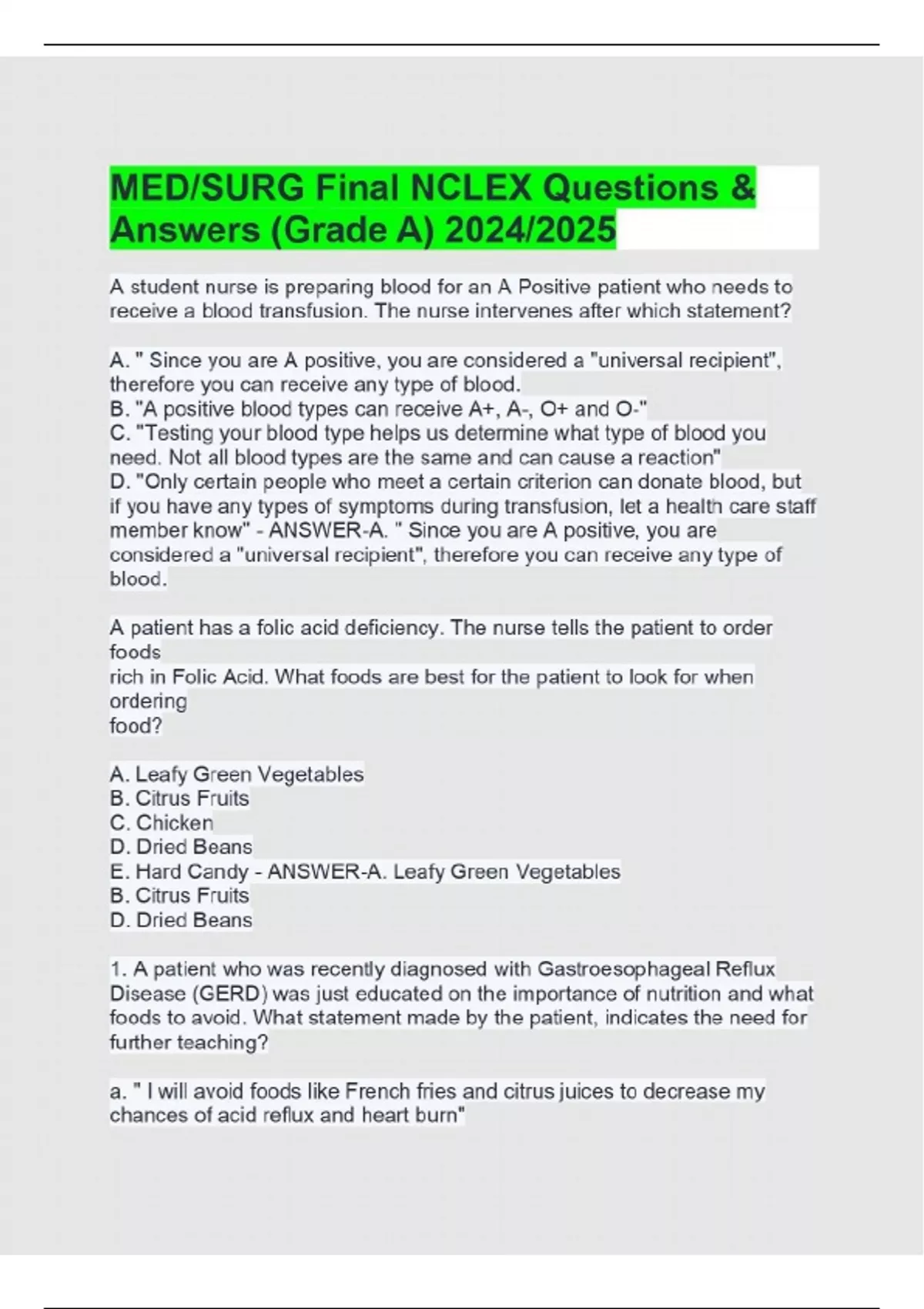 MED/SURG Final NCLEX Questions & Answers (Grade A) 2024/2025 A student nurse is preparing blood for an A Positive patient who needs to receive a blood transfusion. The nurse intervenes after which statement? A. " Since you are A positive, you are considered a "universal recipient", therefore you can receive any type of blood. B. "A positive blood types can receive A+, A-, O+ and O-" C. "Testing your blood type helps us determine what type of blood you need. Not all blood types are the same and can cause a reaction" D. "Only certain people who meet a certain criterion can donate blood, but if you have any types of symptoms during transfusion, let a health care staff member know" - ANSWER-A. " Since you are A positive, you are considered a "universal recipient", therefore you can receive any type of blood. A patient has a folic acid deficiency. The nurse tells the patient to order foods rich in Folic Acid. What foods are best for the patient to look for when ordering food? A. Leafy Green Vegetables B. Citrus Fruits C. Chicken D. Dried Beans E. Hard Candy - ANSWER-A. Leafy Green Vegetables B. Citrus Fruits D. Dried Beans 1. A patient who was recently diagnosed with Gastroesophageal Reflux Disease (GERD) was just educated on the importance of nutrition and what foods to avoid. What statement made by the patient, indicates the need for further teaching? a. " I will avoid foods like French fries and citrus juices to decrease my chances of acid reflux and heart burn" b. "I will continue to drink 2 cups of coffee each morning when I wake up, to make sure I have enough energy for the day" c. " I need to find another dessert I can eat each night before bed, because the chocolate ice cream I eat every night will exacerbate my Gastroesophageal Reflux" d. " I need to drink more room temperature water to make sure my body has help when properly digesting my meals" - ANSWER-B. "I will continue to drink 2 cups of coffee each morning when I wake up, to make sure I have enough energy for the day" A 76-year old man with chronic anemia arrives at the Emergency department with increased fatigue and heart palpitations even at rest. The nurse would expect the patients' laboratory test findings to include: (Select all that apply) a. Hemoglobin (Hgb) of 6.8 g/dL b. Hematocrit (Hct) value of 32% c. An Red Blood Cell count of 4,500,000/L d. A ferritin level of 8.2 ng/mL e. A White Blood Cell count of 6.5 x 109/L - ANSWER-A, B, D a: hemoglobin (Hgb) of 6.8 g/dL b: hematocrit (Hct) value of 32% d: a ferritin level of 8.2 ng/mL A student nurse is explaining the risk factors for metabolic syndrome which statement by the student would require correction from the nurse? A. Waist circumference of 41 for a male B. Body mass index of 30 or higher C. Triglycerides level of 130 D. Blood Glucose of 168 - ANSWER-C. Triglycerides level of 130 A 68 year-old male suffering from chronic diarrhea is found to have a serum phosphate level of 0.9 mg/dL. After reviewing this lab value the nurse can expect the patient to exhibit which of the following symptoms? (Select all that apply) A. Confusion B. Numbness/tingling in extremities C. Muscle weakness D. Cardiac dysrhythmias E. Dry mucous membranes - ANSWER-A. Confusion C. Muscle weakness D. Cardiac dysrhythmias The physician orders an arterial blood gas who is hyperventilating. The nurse can anticipate that the blood gas results will most likely reveal that the patient is in: A. Metabolic alkalosis B. Respiratory acidosis C. Metabolic acidosis D. Respiratory alkalosis - ANSWER-D. Respiratory alkalosis Thalassemia is a group of diseases that causes an inadequate amount of normal hemoglobin to be produced in the body. Thalassemia minor is usually asymptomatic and requires no treatments. There is no cure for thalassemia major, however, there are therapies available to help manage the disease. These include: A. Blood transfusions B. Subcutaneous or IV deferoxamine C. Iron supplements D. Zinc supplements E. Splenectomy - ANSWER-A. Blood transfusions B. Subcutaneous or IV deferoxamine D. Zinc supplements E. Splenectomy A patient diagnosed with Stage II bladder cancer has just received a segmental cystectomy. What will the nurse correct the patient on for postoperative instructions for discharge?: A. "I will drink only small amounts of water for the first week." B. "I will call the doctor if my urine is bright red for the first few days after surgery." C. "After a week, my urine could have dark red flakes, and that's normal." D. "I have a follow-up appointment for a cystoscopy in a few weeks." - ANSWER-A. "I will drink only small amounts of water for the first week." A patient with upper gastrointestinal cancer has been diagnosed with cancer cachexia which of the following would the nurse expect to see? A. Weight gain Continues...
