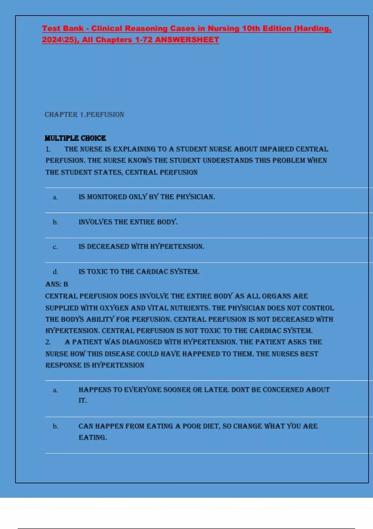 Test Bank - Clinical Reasoning Cases in Nursing 7th Edition (Harding, 2019), All Chapters 1-72 ||Latest ||Answersheet||Verified by experts ISBN-10. 0323527361. ISBN-13. 978-0323527361. Edition. 7th. Publisher. Mosby. Publication date. February 7, 20