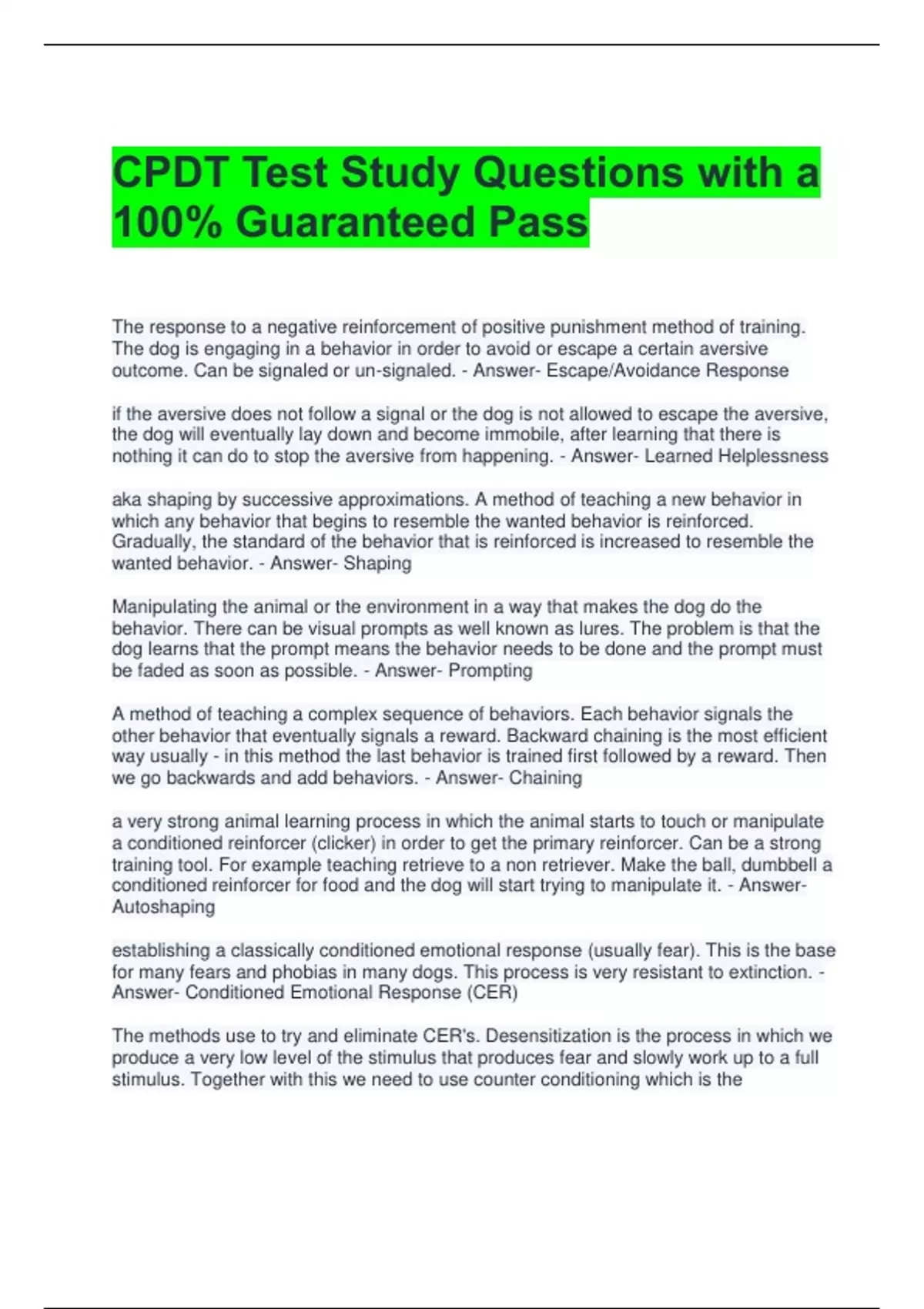 CPDT Test Study Questions with a 100% Guaranteed Pass The response to a negative reinforcement of positive punishment method of training. The dog is engaging in a behavior in order to avoid or escape a certain aversive outcome. Can be signaled or un-signaled. - Answer- Escape/Avoidance Response if the aversive does not follow a signal or the dog is not allowed to escape the aversive, the dog will eventually lay down and become immobile, after learning that there is nothing it can do to stop the aversive from happening. - Answer- Learned Helplessness aka shaping by successive approximations. A method of teaching a new behavior in which any behavior that begins to resemble the wanted behavior is reinforced. Gradually, the standard of the behavior that is reinforced is increased to resemble the wanted behavior. - Answer- Shaping Manipulating the animal or the environment in a way that makes the dog do the behavior. There can be visual prompts as well known as lures. The problem is that the dog learns that the prompt means the behavior needs to be done and the prompt must be faded as soon as possible. - Answer- Prompting A method of teaching a complex sequence of behaviors. Each behavior signals the other behavior that eventually signals a reward. Backward chaining is the most efficient way usually - in this method the last behavior is trained first followed by a reward. Then we go backwards and add behaviors. - Answer- Chaining a very strong animal learning process in which the animal starts to touch or manipulate a conditioned reinforcer (clicker) in order to get the primary reinforcer. Can be a strong training tool. For example teaching retrieve to a non retriever. Make the ball, dumbbell a conditioned reinforcer for food and the dog will start trying to manipulate it. - Answer- Autoshaping establishing a classically conditioned emotional response (usually fear). This is the base for many fears and phobias in many dogs. This process is very resistant to extinction. - Answer- Conditioned Emotional Response (CER)