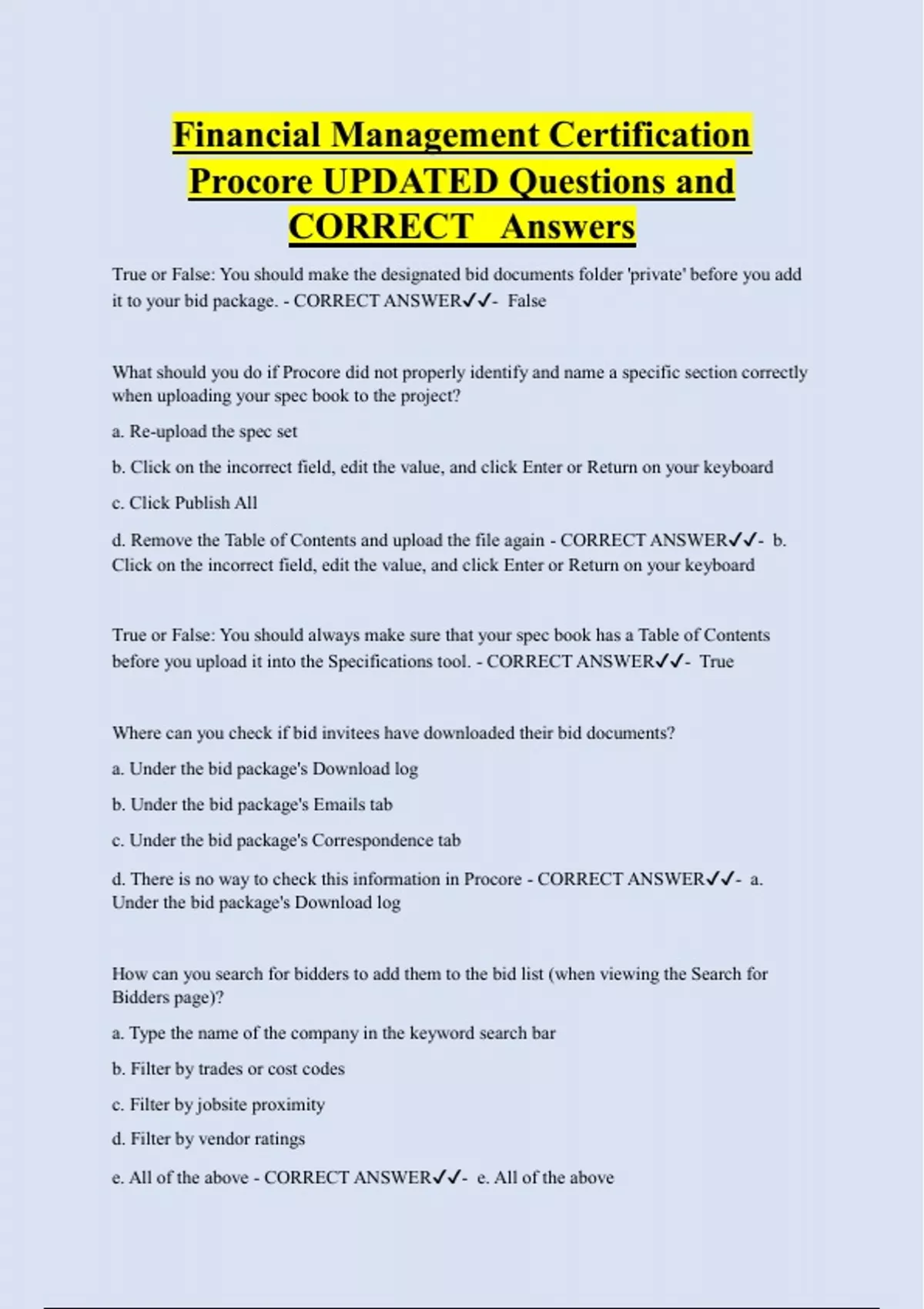 Financial Management Certification Procore UPDATED Questions and CORRECT Answers True or False: You should make the designated bid documents folder 'private' before you add it to your bid package. - CORRECT ANSWER- False What should you do if Procore did not properly identify and name a specific section correctly when uploading your spec book to the project?