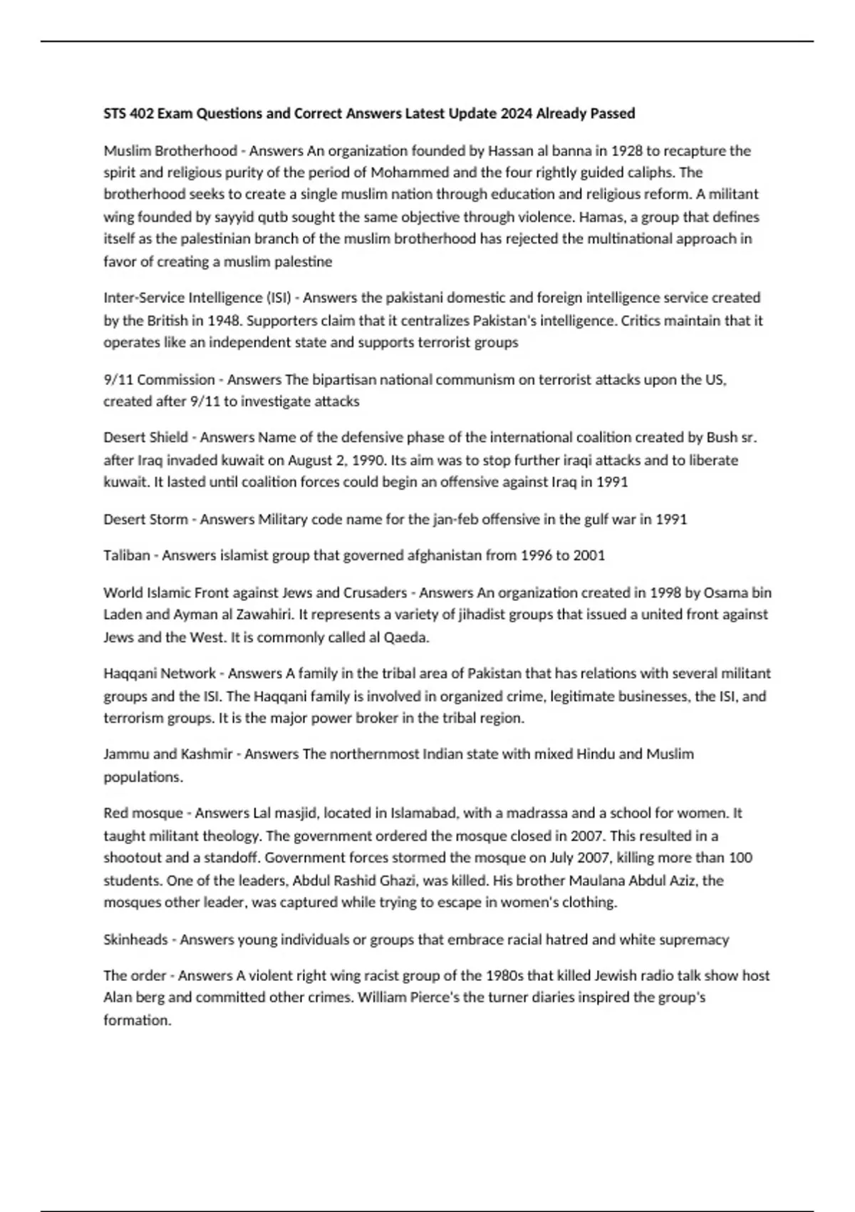 STS 402 Exam Questions and Correct Answers Latest Update 2024 Already Passed Muslim Brotherhood - Answers An organization founded by Hassan al banna in 1928 to recapture the spirit and religious purity of the period of Mohammed and the four rightly guided caliphs. The brotherhood seeks to create a single muslim nation through education and religious reform. A militant wing founded by sayyid qutb sought the same objective through violence. Hamas, a group that defines itself as the palestinian branch of the muslim brotherhood has rejected the multinational approach in favor of creating a muslim palestine Inter-Service Intelligence (ISI) - Answers the pakistani domestic and foreign intelligence service created by the British in 1948. Supporters claim that it centralizes Pakistan's intelligence. Critics maintain that it operates like an independent state and supports terrorist groups 9/11 Commission - Answers The bipartisan national communism on terrorist attacks upon the US, created after 9/11 to investigate attacks Desert Shield - Answers Name of the defensive phase of the international coalition created by Bush sr. after Iraq invaded kuwait on August 2, 1990. Its aim was to stop further iraqi attacks and to liberate kuwait. It lasted until coalition forces could begin an offensive against Iraq in 1991 Desert Storm - Answers Military code name for the jan-feb offensive in the gulf war in 1991 Taliban - Answers islamist group that governed afghanistan from 1996 to 2001 World Islamic Front against Jews and Crusaders - Answers An organization created in 1998 by Osama bin Laden and Ayman al Zawahiri. It represents a variety of jihadist groups that issued a united front against Jews and the West. It is commonly called al Qaeda. Haqqani Network - Answers A family in the tribal area of Pakistan that has relations with several militant groups and the ISI. The Haqqani family is involved in organized crime, legitimate businesses, the ISI, and terrorism groups. It is the major power broker in the tribal region. Jammu and Kashmir - Answers The northernmost Indian state with mixed Hindu and Muslim populations. Red mosque - Answers Lal masjid, located in Islamabad, with a madrassa and a school for women. It taught militant theology. The government ordered the mosque closed in 2007. This resulted in a shootout and a standoff. Government forces stormed the mosque on July 2007, killing more than 100 students. One of the leaders, Abdul Rashid Ghazi, was killed. His brother Maulana Abdul Aziz, the mosques other leader, was captured while trying to escape in women's clothing. Skinheads - Answers young individuals or groups that embrace racial hatred and white supremacy The order - Answers A violent right wing racist group of the 1980s that killed Jewish radio talk show host Alan berg and committed other crimes. William Pierce's the turner diaries inspired the group's formation. Fourteen words - Answers Racist words coined by david lane, a member of the order: "We must secure the existence of our people and a future for white children. Free-Wheeling Fundamentalism - Answers A term to describe white supremacists or christian patriots who either selectively use bible passages or personal scripture interpretations to justify the patriot agenda Anglo-Israelism - Answers The belief that the lost tribes of Israel settled in western Europe. Christian Identity - Answers An American extremist religion proclaiming white supremacy. Adherents believe that white Protestants of western European origin are the true descendants of the ancient Israelites. Believers contend that Jews were spawned by Satan and that nonwhites evolved from animals. According to this belief, white men and women are the only people created in the image of God. Nordic christianity - Answers A religion that incorporates the ancient Norse gods in a hierarchy under the Christian triune deity. It is similar to Odinism, but it does not completely abandon Christianity. Creativity - Answers The deistic religion of the creativity movement. It claims that white people must struggle to defeat jews and nonwhite races/ Ben Klassen - Answers The founder of the Creativity Movement Knight riders - Answers The first terrorists of the Ku Klux Klan. Donning hoods and riding at night, they sought to keep newly freed slaves from participating in government and society. Sovereign citizens - Answers People who believe that they are not subject to the laws and regulations of the United States. They self-declare that they are individually free of driver's licenses, car registrations, and tax laws. they frequently hold their own legal proceedings and issue orders that have no binding legal authority. Moorish Nation - Answers An African American group that does not recognize the validity of the U.S. government. Paper terrorism - Answers Uses fake documents to clog legal, financial or bureaucratic processes. New world order - Answers A phrase used by President George H. W. Bush to describe the world after the fall of the Soviet Union. Conspiracy theorists use the phrase to describe what they believe to be Jewish attempts to gain control of the international monetary system and, subsequently, to take over the U.S. government.