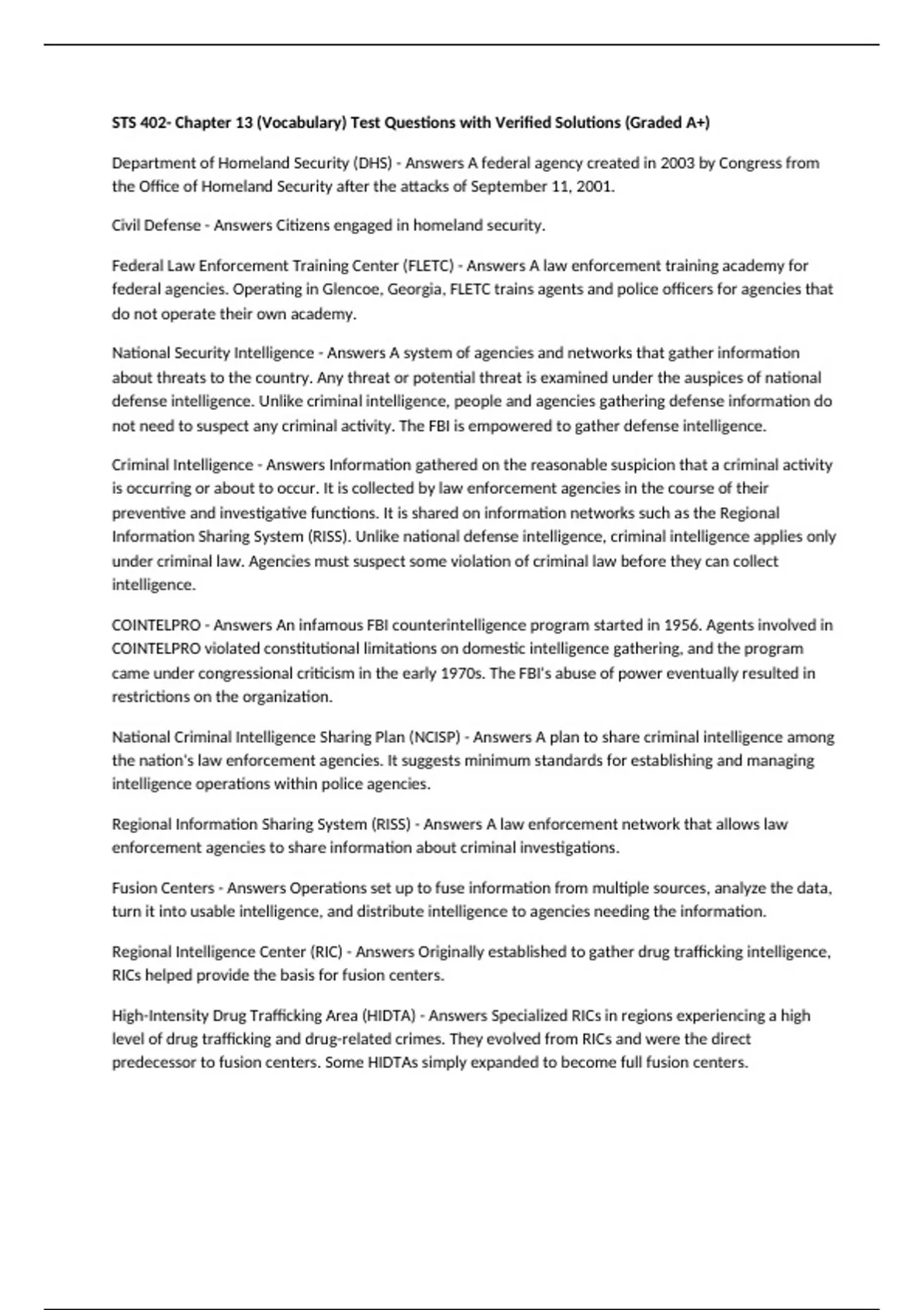 STS 402- Chapter 13 (Vocabulary) Test Questions with Verified Solutions (Graded A+) Department of Homeland Security (DHS) - Answers A federal agency created in 2003 by Congress from the Office of Homeland Security after the attacks of September 11, 2001. Civil Defense - Answers Citizens engaged in homeland security. Federal Law Enforcement Training Center (FLETC) - Answers A law enforcement training academy for federal agencies. Operating in Glencoe, Georgia, FLETC trains agents and police officers for agencies that do not operate their own academy. National Security Intelligence - Answers A system of agencies and networks that gather information about threats to the country. Any threat or potential threat is examined under the auspices of national defense intelligence. Unlike criminal intelligence, people and agencies gathering defense information do not need to suspect any criminal activity. The FBI is empowered to gather defense intelligence. Criminal Intelligence - Answers Information gathered on the reasonable suspicion that a criminal activity is occurring or about to occur. It is collected by law enforcement agencies in the course of their preventive and investigative functions. It is shared on information networks such as the Regional Information Sharing System (RISS). Unlike national defense intelligence, criminal intelligence applies only under criminal law. Agencies must suspect some violation of criminal law before they can collect intelligence. COINTELPRO - Answers An infamous FBI counterintelligence program started in 1956. Agents involved in COINTELPRO violated constitutional limitations on domestic intelligence gathering, and the program came under congressional criticism in the early 1970s. The FBI's abuse of power eventually resulted in restrictions on the organization. National Criminal Intelligence Sharing Plan (NCISP) - Answers A plan to share criminal intelligence among the nation's law enforcement agencies. It suggests minimum standards for establishing and managing intelligence operations within police agencies. Regional Information Sharing System (RISS) - Answers A law enforcement network that allows law enforcement agencies to share information about criminal investigations. Fusion Centers - Answers Operations set up to fuse information from multiple sources, analyze the data, turn it into usable intelligence, and distribute intelligence to agencies needing the information. Regional Intelligence Center (RIC) - Answers Originally established to gather drug trafficking intelligence, RICs helped provide the basis for fusion centers.