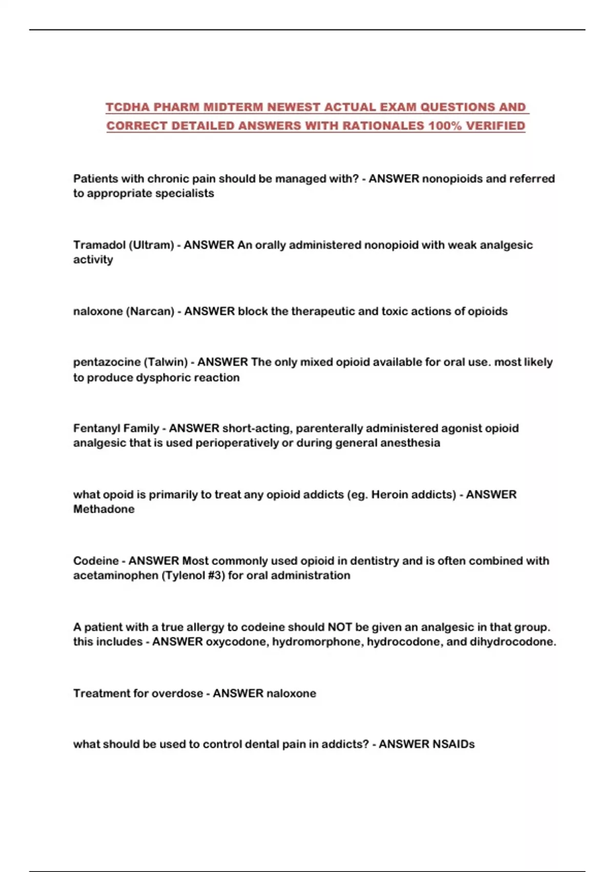 TCDHA PHARM MIDTERM NEWEST ACTUAL EXAM QUESTIONS AND
