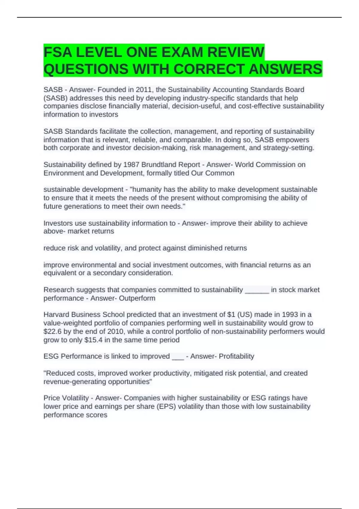 FSA LEVEL ONE EXAM REVIEW QUESTIONS WITH CORRECT ANSWERS