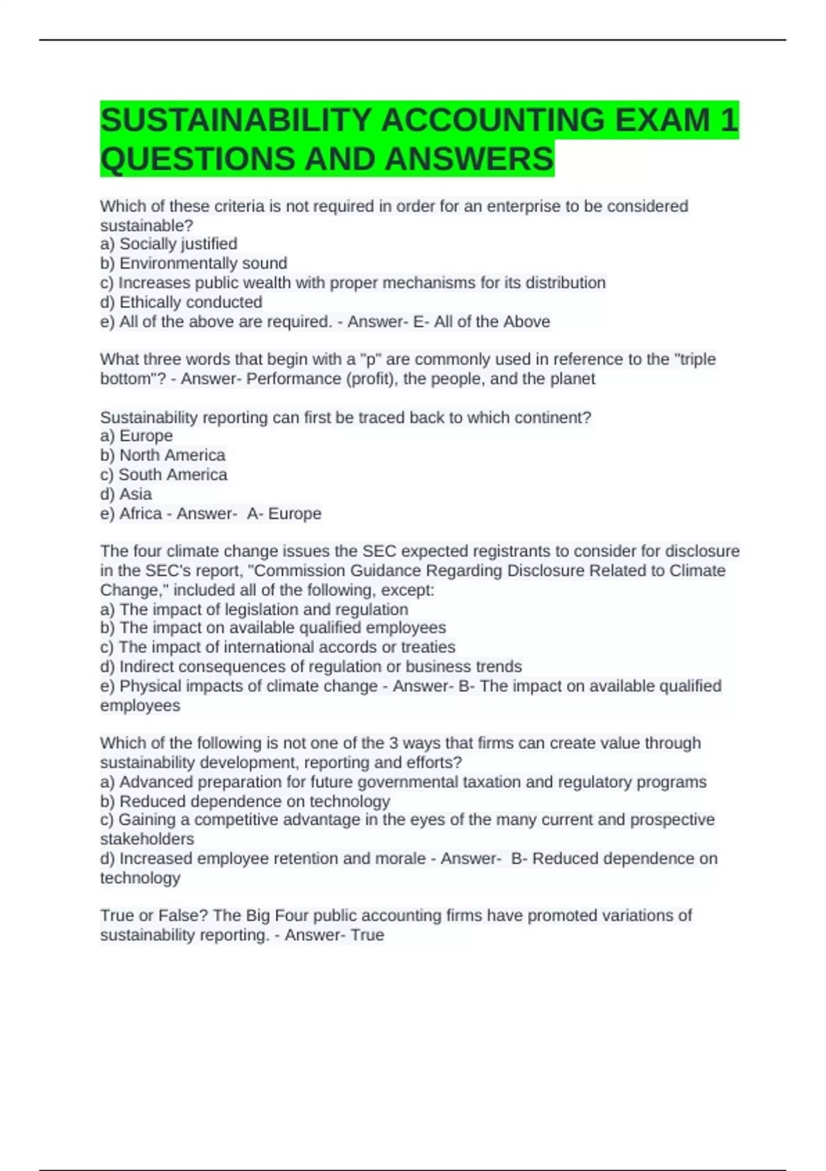 SUSTAINABILITY ACCOUNTING EXAM 1 QUESTIONS AND ANSWERS