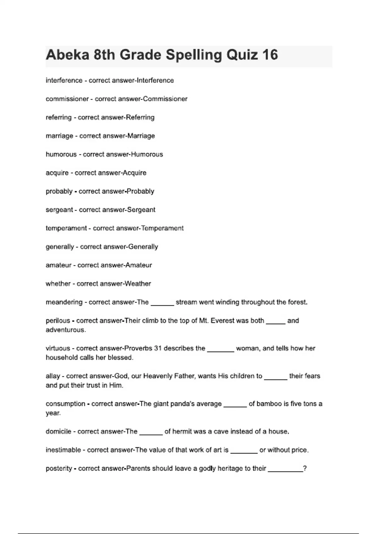 Abeka 8th Grade Spelling Quiz 16 questions and answers