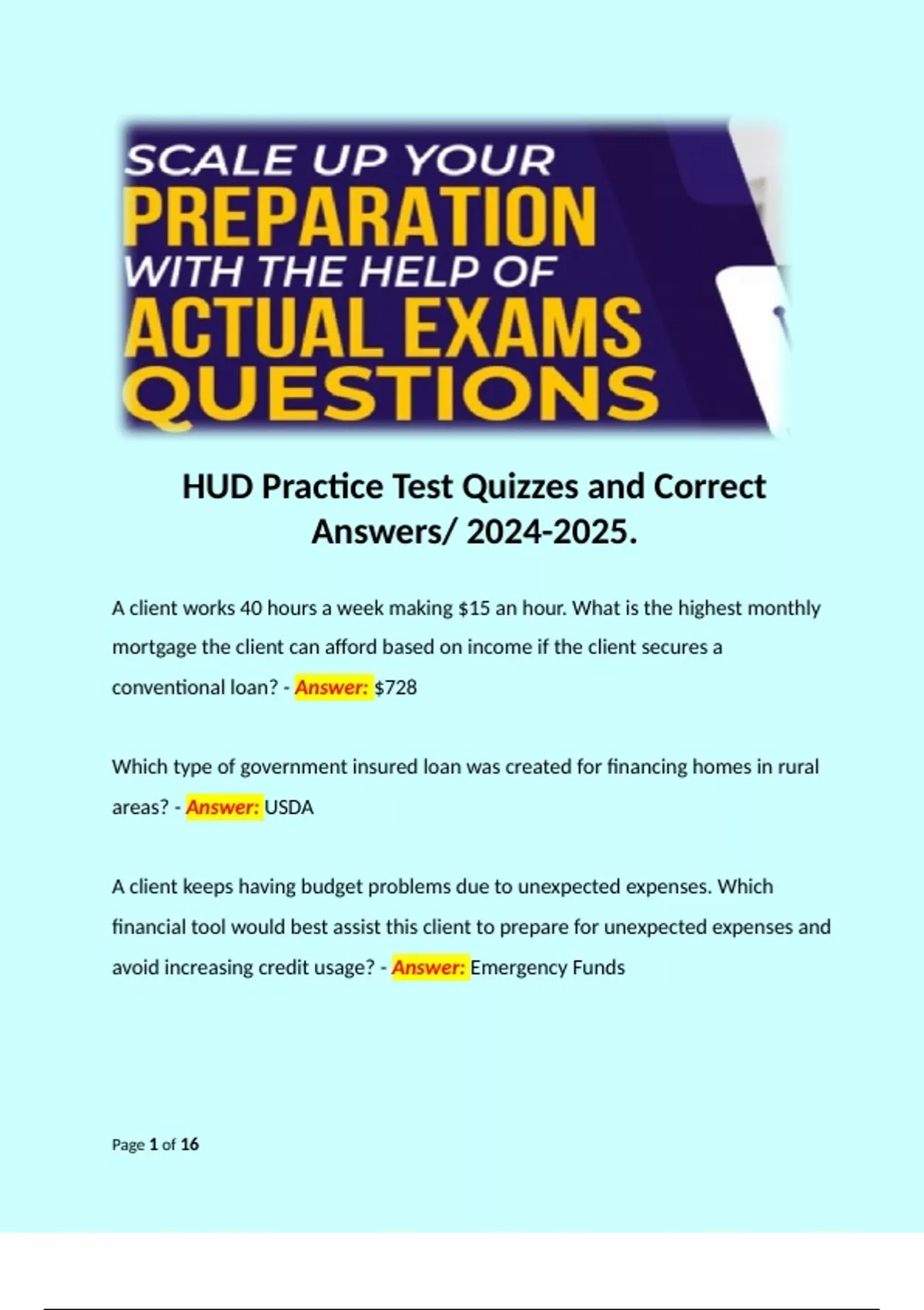 HUD Practice Test Quizzes and Correct Answers/ . A client works 40 hours a week making $15 an hour. What is the highest monthly mortgage the client can afford based on income if the client secures a conventional loan? - Answer: $728 Which type of government insured loan was created for financing homes in rural areas? - Answer: USDA A client keeps having budget problems due to unexpected expenses. Which financial tool would best assist this client to prepare for unexpected expenses and avoid increasing credit usage? - Answer: Emergency Funds A client has a monthly household income of $2,300, monthly debt payments of $450, and an optimal monthly housing ratio of 32%. What is the client's optimal monthly housing payment? - Answer: $736 Use Front-End Ratio What is the back-end ratio for a client with a monthly housing expense of $1,250, a monthly total of $88 in other consumer debt payments, and a gross household income of $4,460 per month (rounded to the nearest whole percent)? - Answer: 30% A client earns a salary of $45,000 at a job held for three years. The client has credit card bills, student loans, and a car loan totaling $500 per month. The client has already saved $3,500 for a down payment and is using an FHA Energy Efficient Mortgage (EEM). If the client wants to make the minimum down payment for a home priced at $150,000, how much more does the client need to save? - Answer: $1,750