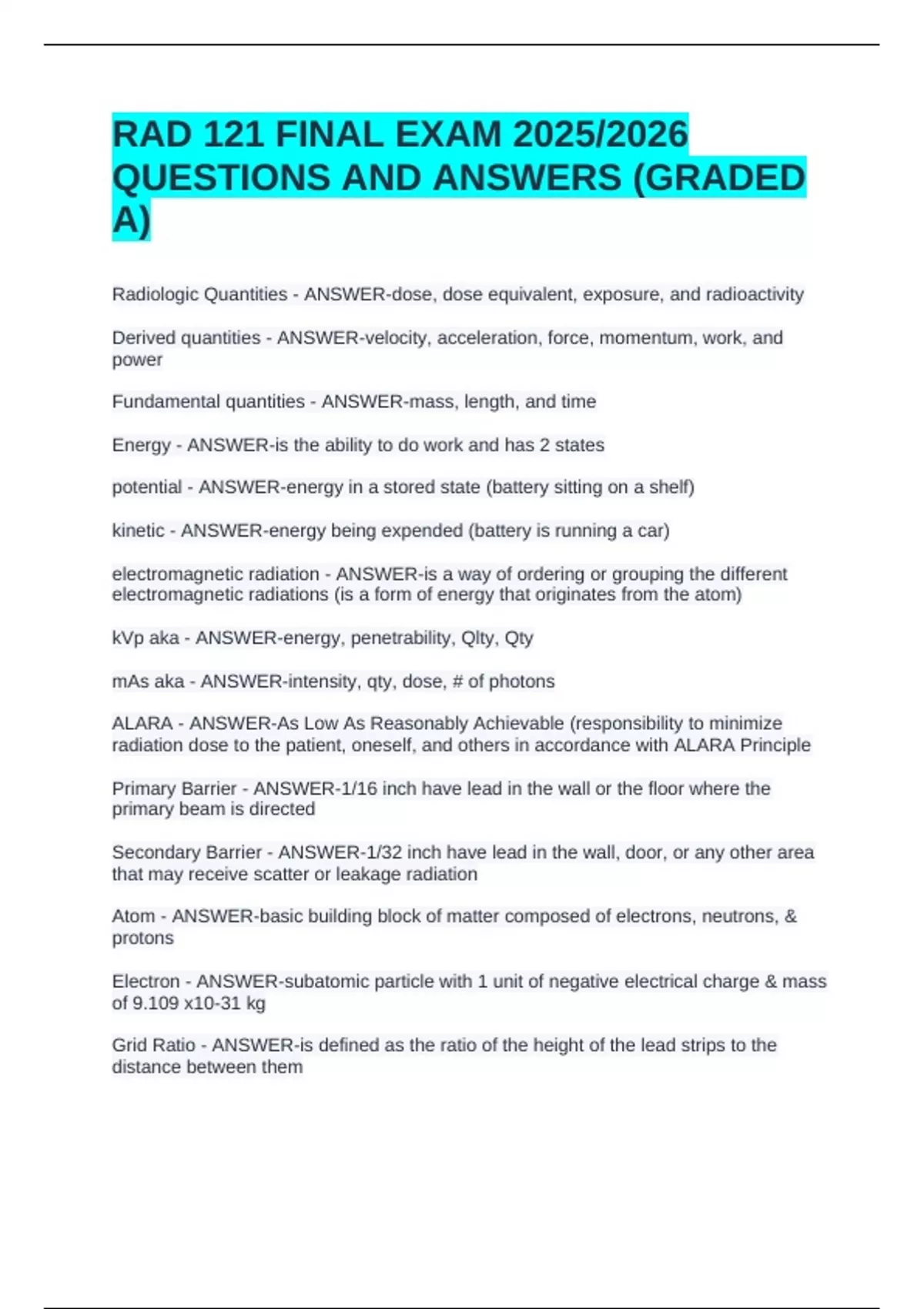 RAD 121 FINAL EXAM 2025/2026 QUESTIONS AND ANSWERS (GRADED A)RAD 121 FINAL EXAM 2025/2026 QUESTIONS AND ANSWERS (GRADED A)RAD 121 FINAL EXAM 2025/2026 QUESTIONS AND ANSWERS (GRADED A) Radiologic Quantities - ANSWER-dose, dose equivalent, exposure, and radioactivity Derived quantities - ANSWER-velocity, acceleration, force, momentum, work, and power Fundamental quantities - ANSWER-mass, length, and time Energy - ANSWER-is the ability to do work and has 2 states potential - ANSWER-energy in a stored state (battery sitting on a shelf)