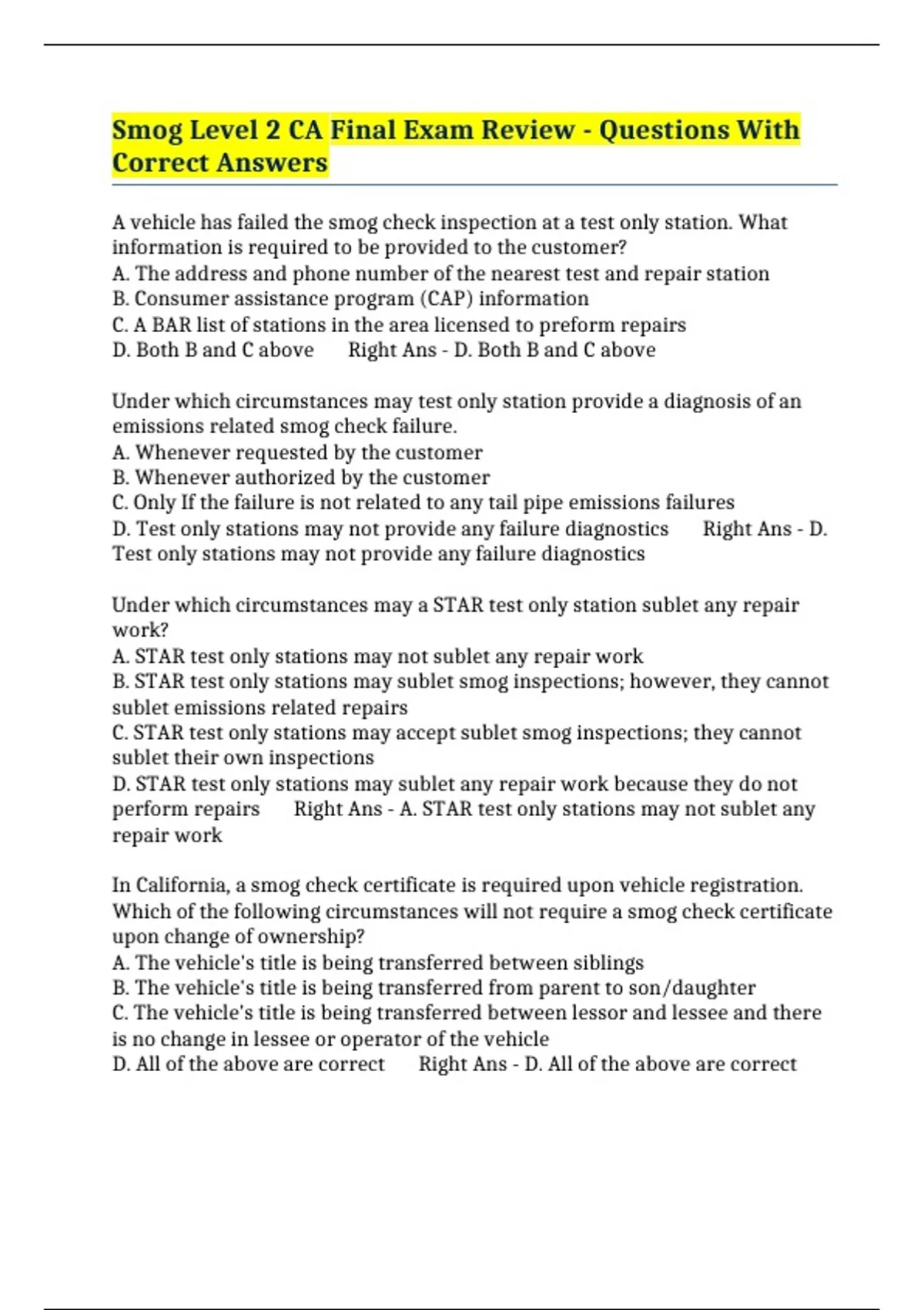 Smog Level 2 CA Final Exam Review - Questions With