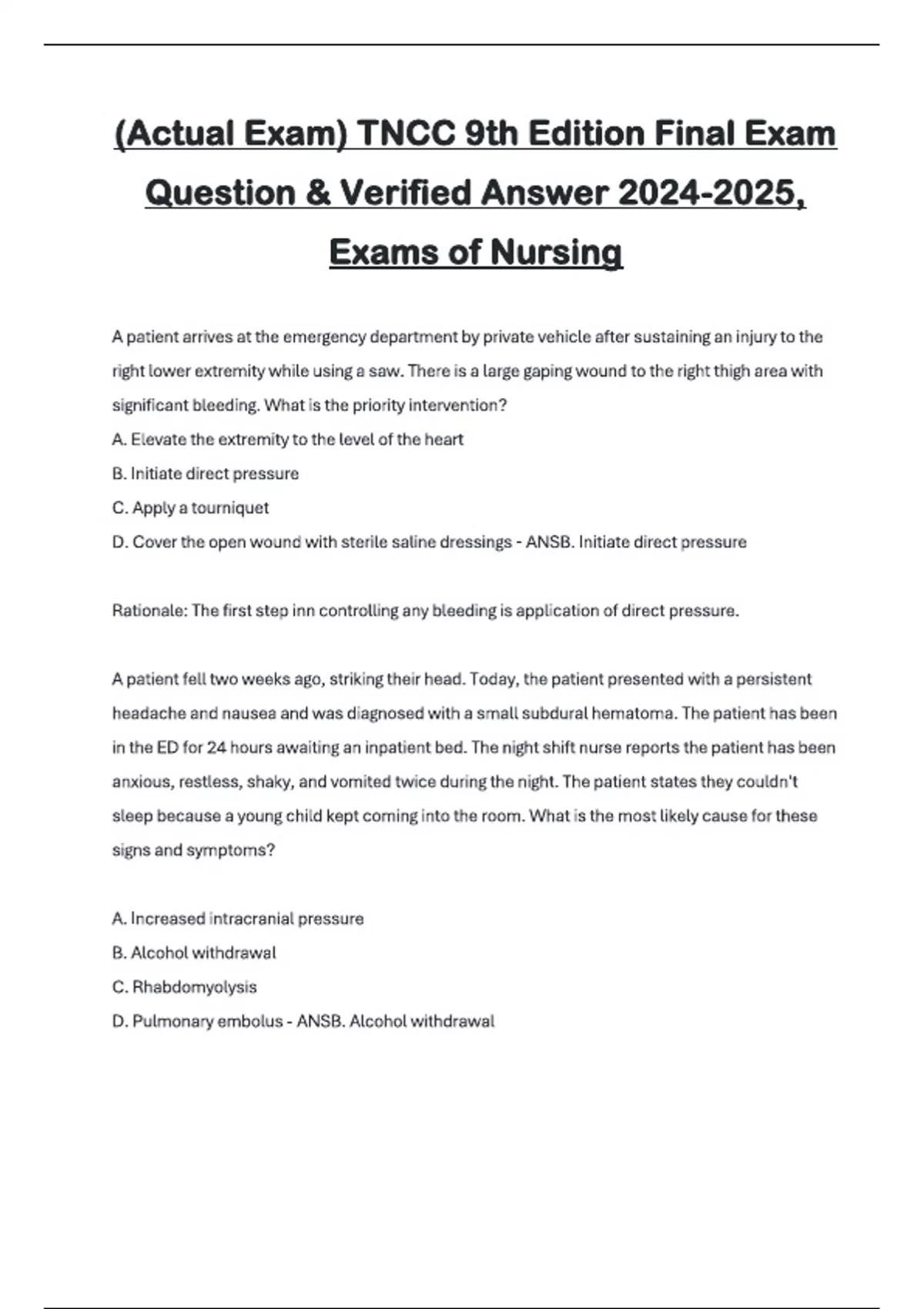 (Actual Exam) TNCC 9th Edition Final Exam Question & Verified Answer , Exams of Nursing (Actual Exam) TNCC 9th Edition Final Exam Question & Verified Answer , Exams of Nursing (Actual Exam) TNCC 9th Edition Final Exam Question & Verified Answer , Exams of Nursing (Actual Exam) TNCC 9th Edition Final Exam Question & Verified Answer , Exams of Nursing