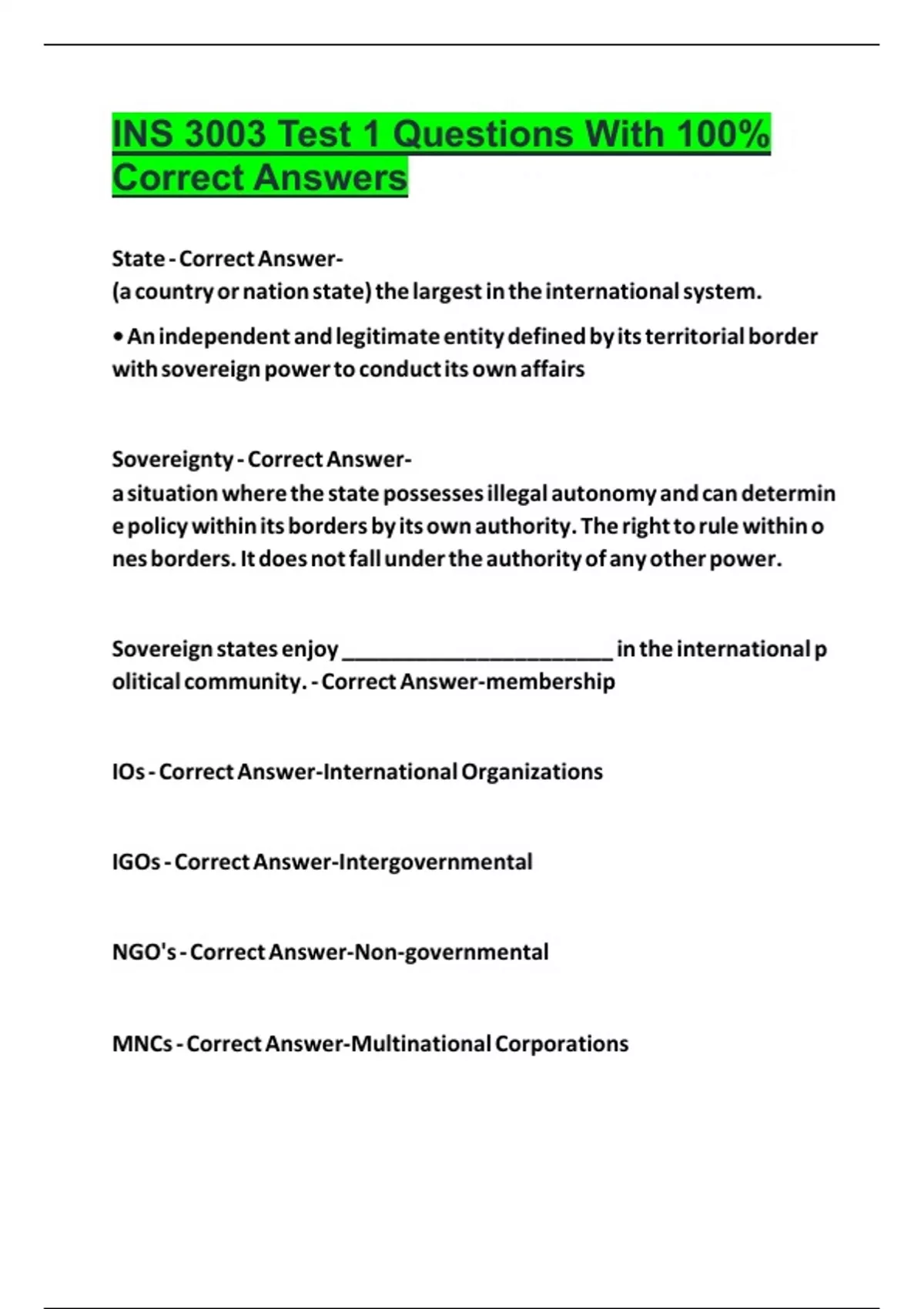 INS 3003 Test 1 Questions With 100% Correct Answers 2024
