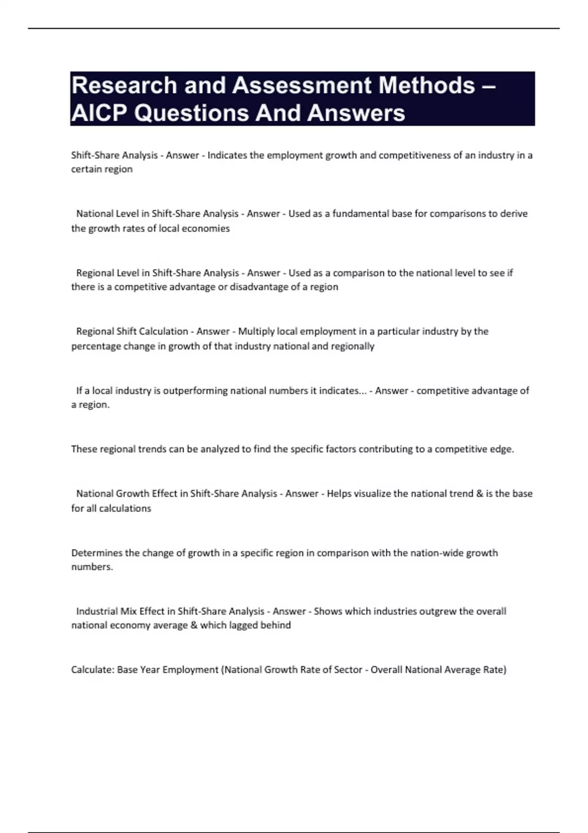 Shift-Share Analysis - Answer - Indicates the employment growth and competitiveness of an industry in a