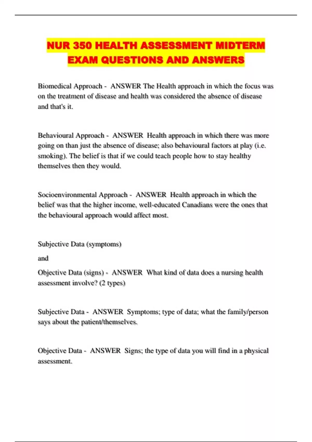 NUR 350 HEALTH ASSESSMENT MIDTERM EXAM QUESTIONS AND ANSWERS