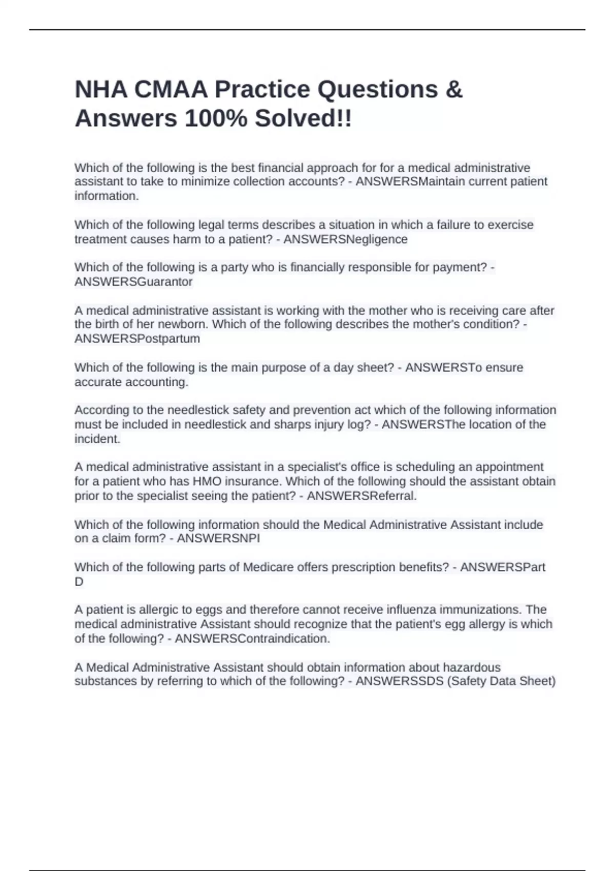 Which of the following is the best financial approach for for a medical administrative assistant to take to minimize collection accounts? - ANSWERSMaintain current patient information. Which of the following legal terms describes a situation in which a failure to exercise treatment causes harm to a patient? - ANSWERSNegligence Which of the following is a party who is financially responsible for payment? - ANSWERSGuarantor A medical administrative assistant is working with the mother who is receiving care after the birth of her newborn. Which of the following describes the mother's condition? - ANSWERSPostpartum Which of the following is the main purpose of a day sheet? - ANSWERSTo ensure accurate accounting. According to the needlestick safety and prevention act which of the following information must be included in needlestick and sharps injury log? - ANSWERSThe location of the incident. A medical administrative assistant in a specialist's office is scheduling an appointment for a patient who has HMO insurance. Which of the following should the assistant obtain prior to the specialist seeing the patient? - ANSWERSReferral. Which of the following information should the Medical Administrative Assistant include on a claim form? - ANSWERSNPI Which of the following parts of Medicare offers prescription benefits? - ANSWERSPart D A patient is allergic to eggs and therefore cannot receive influenza immunizations. The medical administrative Assistant should recognize that the patient's egg allergy is which of the following? - ANSWERSContraindication.